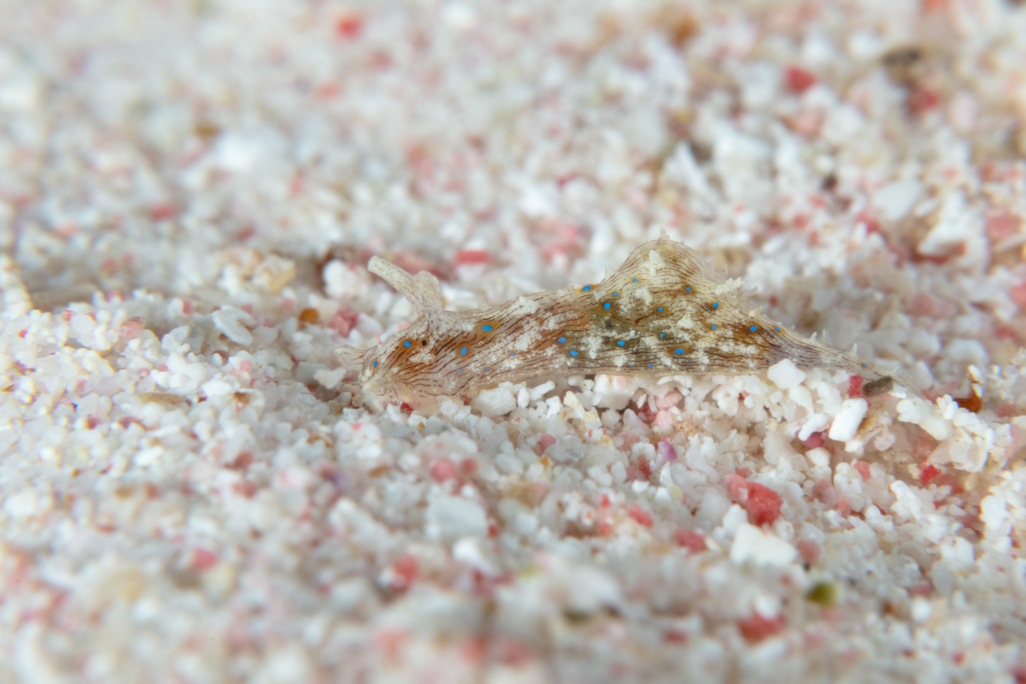 This Seahare has a tan body with blue spots and thin brown lines running across it. There is a large hump in the center of its body. The tail is long, tapering, and has small appendages along its length.