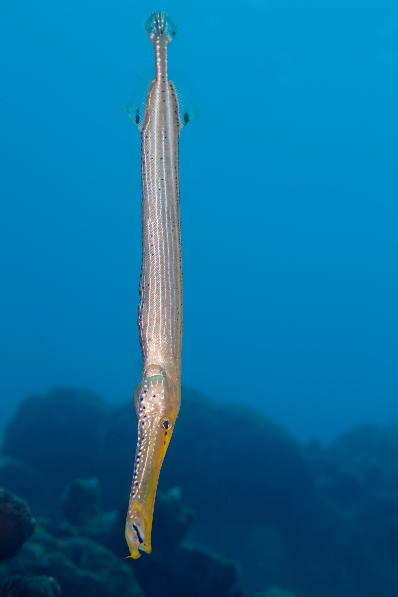 The Atlantic Trumpetfish often hovers in a vertical position with its head pointing downward, staying close to Sea Rods or other elongated structures to blend in. It sometimes uses shadow feeding, swimming just above larger fish to stay hidden while hunting.