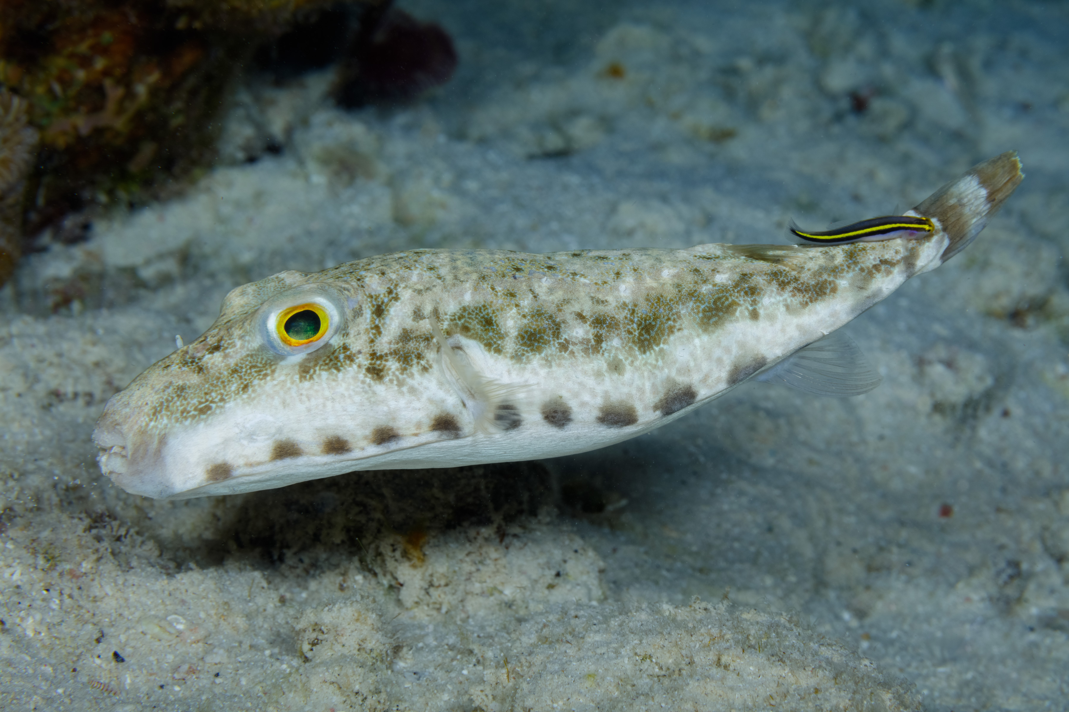 This Pufferfish has two dark bands on its tail and a row of dark blotches running from its mouth to the base of the tail. Its upper body is olive-brown with white and blue spots, while the underside is white. It can change its color to blend into its surroundings.