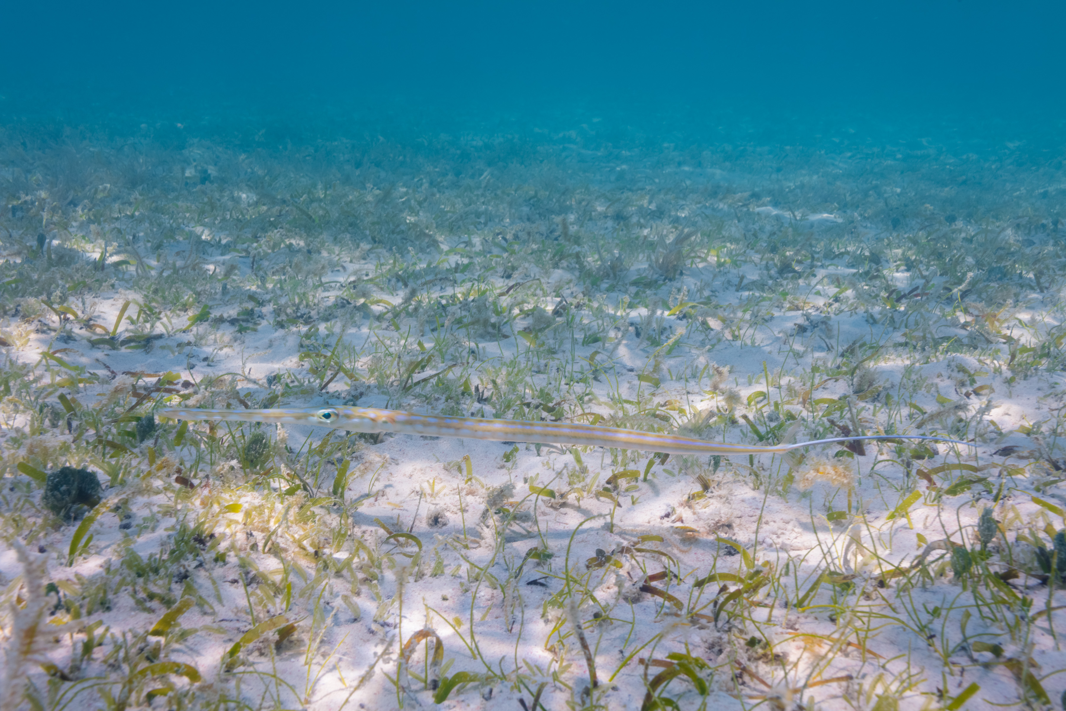 The Bluespotted Cornetfish can be found swimming over shallow seagrass beds. It tends to be cautious around divers and usually stays at a distance.