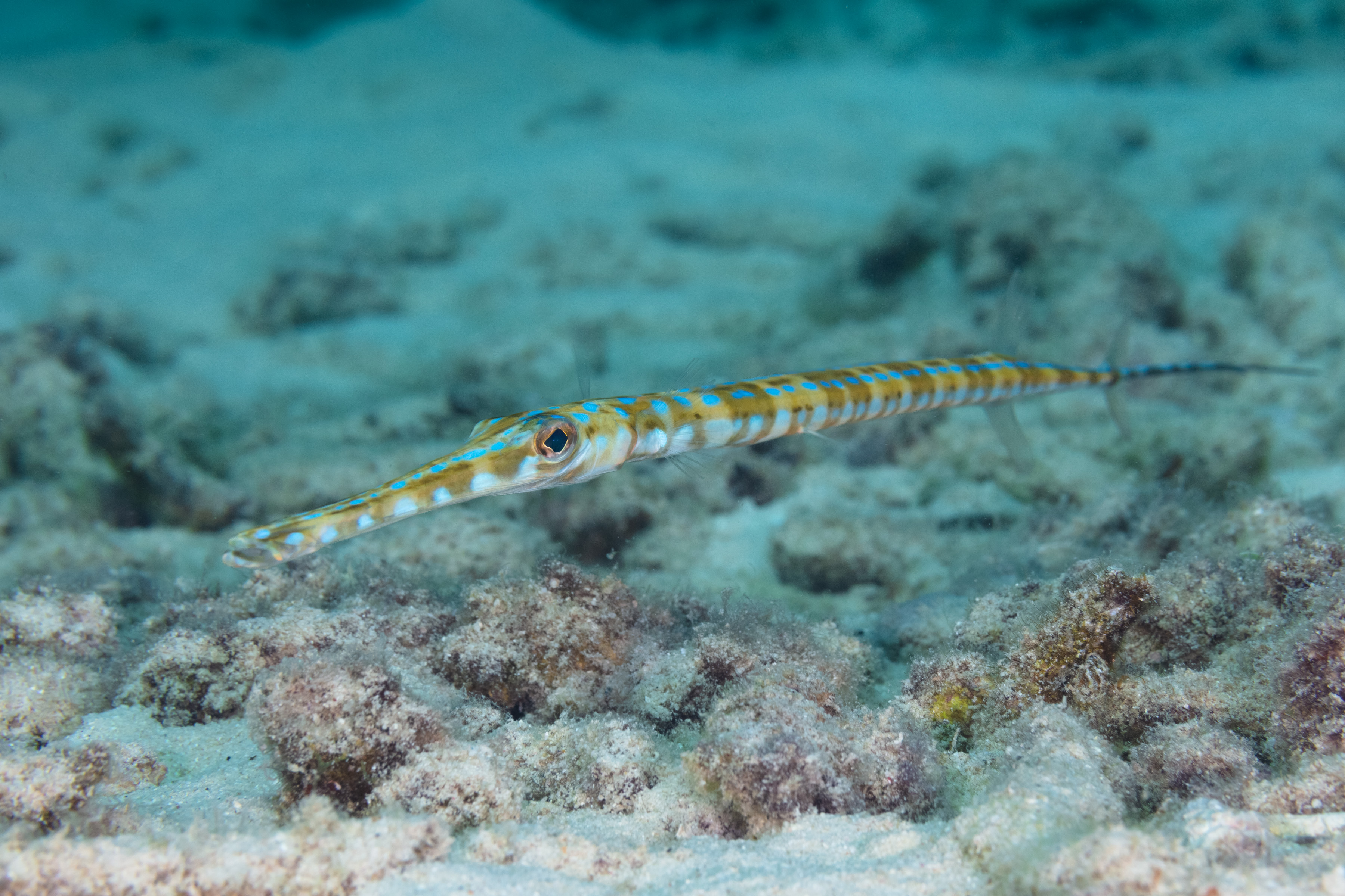 The Bluespotted Cornetfish can be found swimming over shallow seagrass beds. It tends to be cautious around divers and usually stays at a distance.