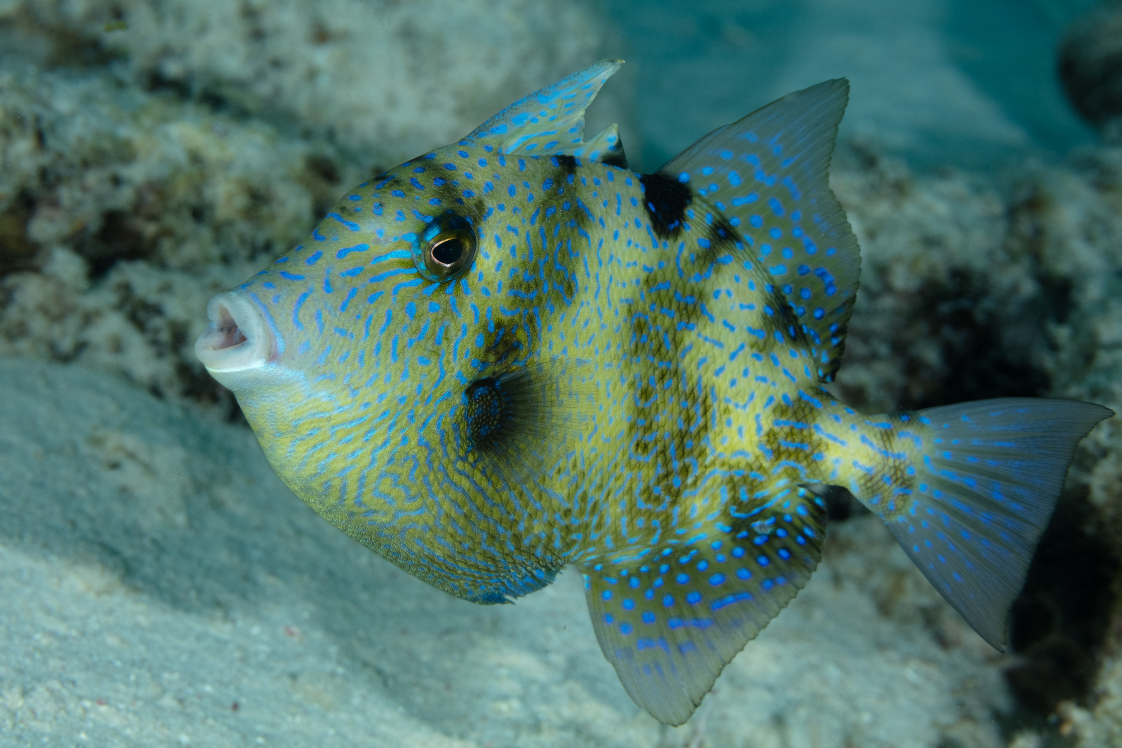 This Triggerfish has blue spots and lines on its upper body and fins. Its color varies from gray to olive-gray or brown, sometimes showing faint bars or blotches on the upper body, while the lower body has fewer blue or white dots and lines.
