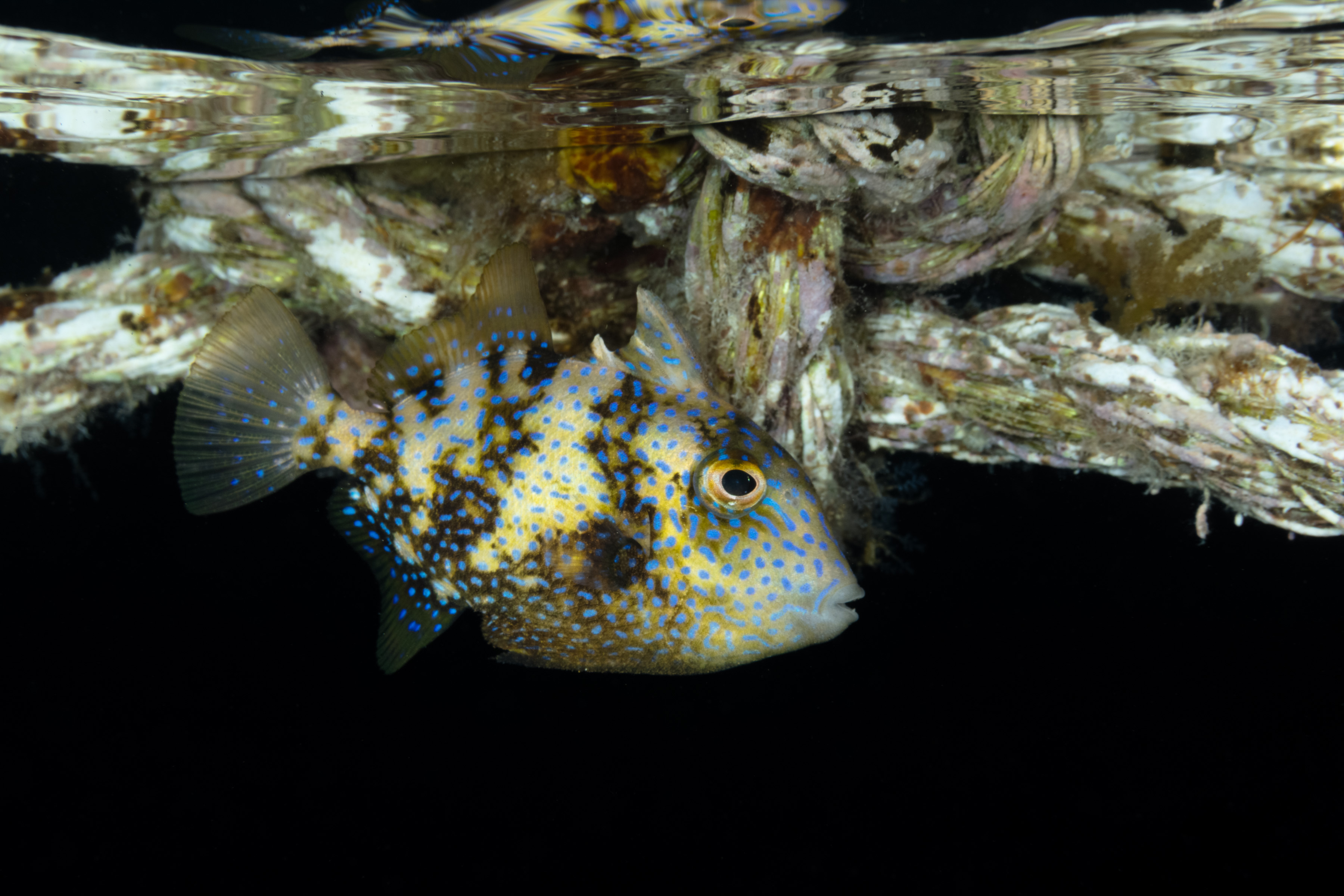 This Triggerfish has blue spots and lines on its upper body and fins. Its color varies from gray to olive-gray or brown, sometimes showing faint bars or blotches on the upper body, while the lower body has fewer blue or white dots and lines.