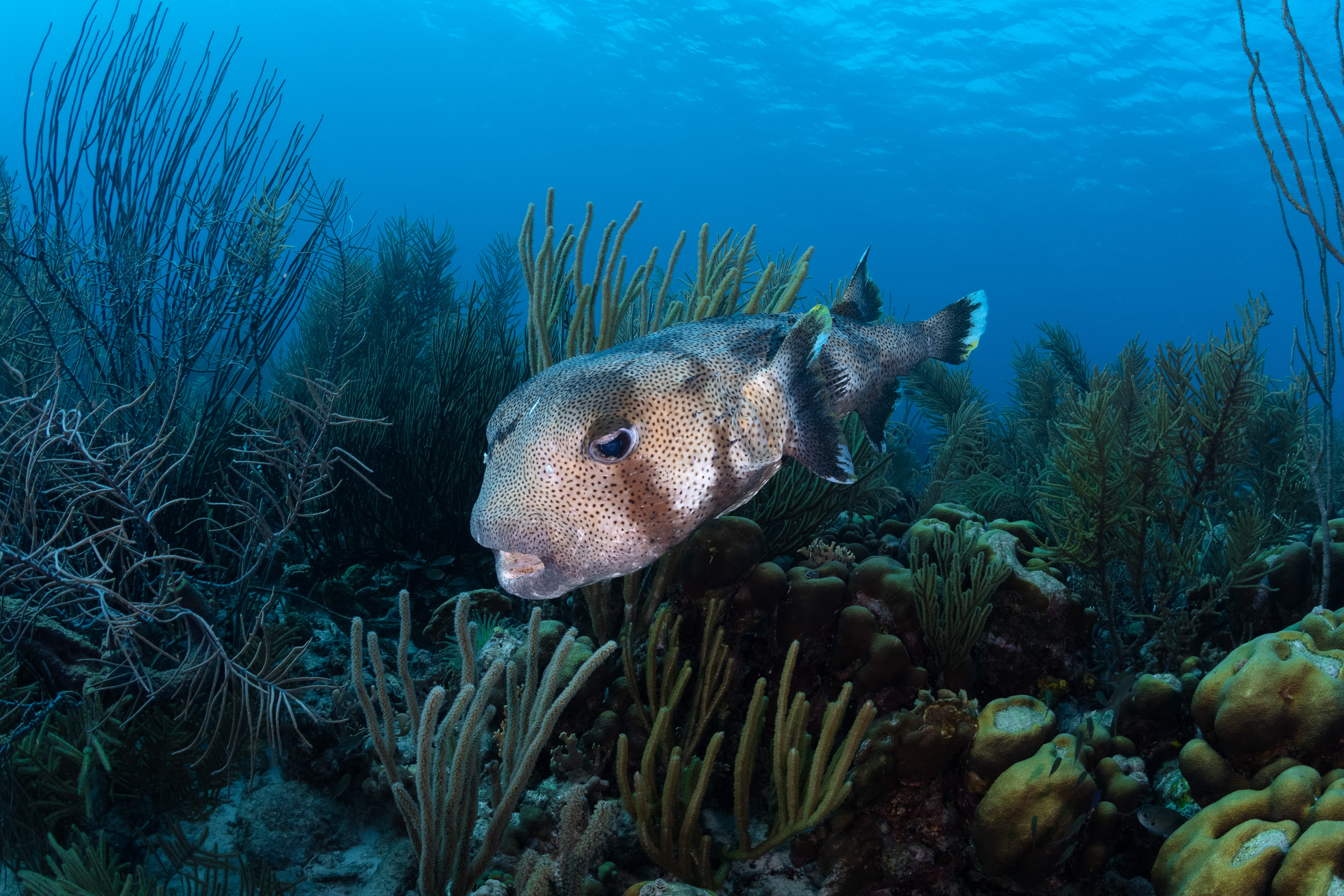 This Porcupinefish has small, dark spots covering its entire body, including the fins. Its color ranges from beige to brown, gradually fading to white on the belly. The many spines on its body usually lie flat against it.