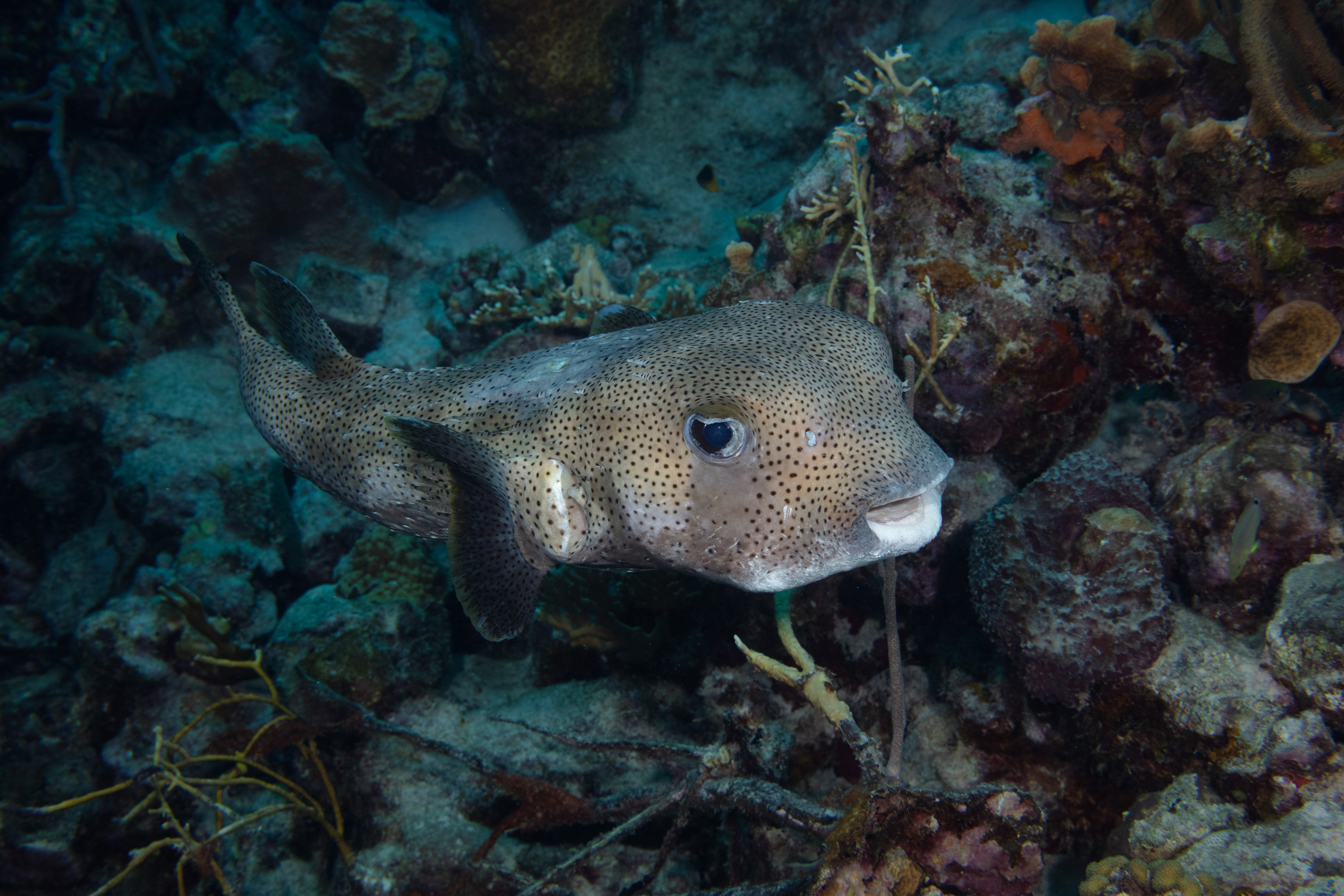 This Porcupinefish has small, dark spots covering its entire body, including the fins. Its color ranges from beige to brown, gradually fading to white on the belly. The many spines on its body usually lie flat against it.