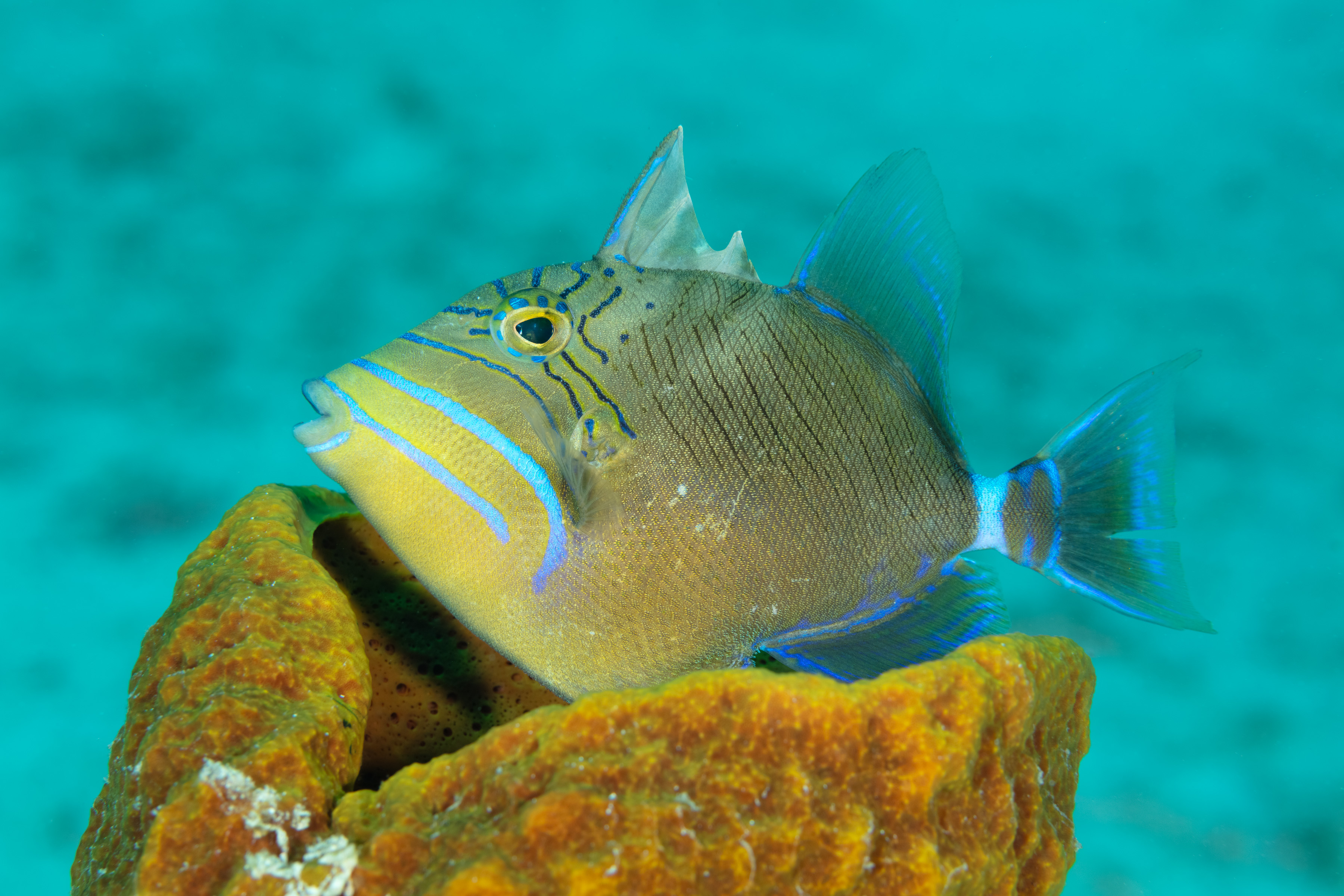 This Triggerfish has a body that ranges in shades of purple, blue, turquoise, and green, with a yellowish hue on the lower head. Two bright blue lines curve across its face, and thin lines extend outward from the eyes. The rear dorsal and tail fins have long, pointed tips.