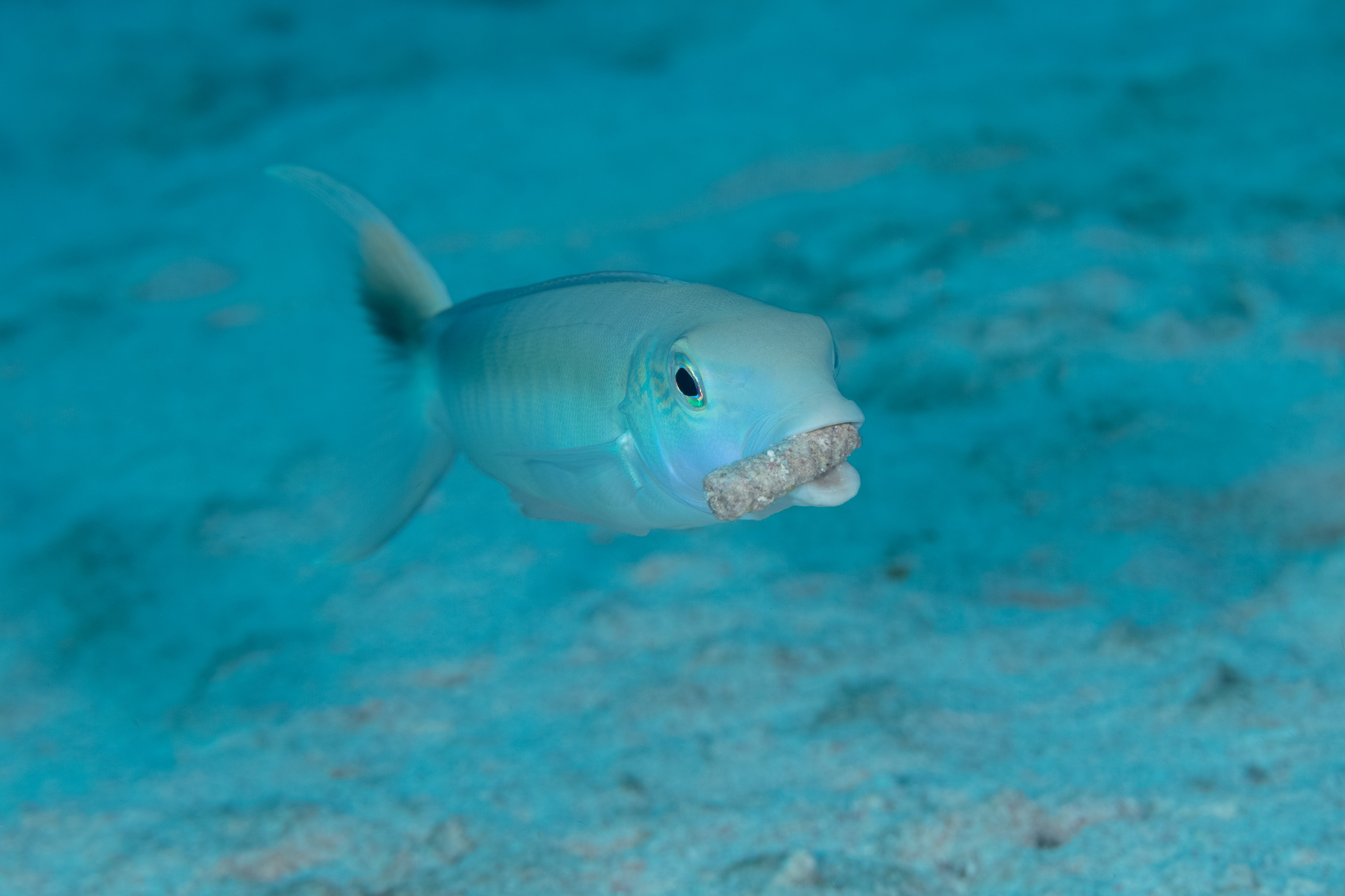 The Sand Tilefish builds burrows in sandy areas using bits of rubble and stays close to the entrance. It is wary and quickly retreats into its burrow when approached.