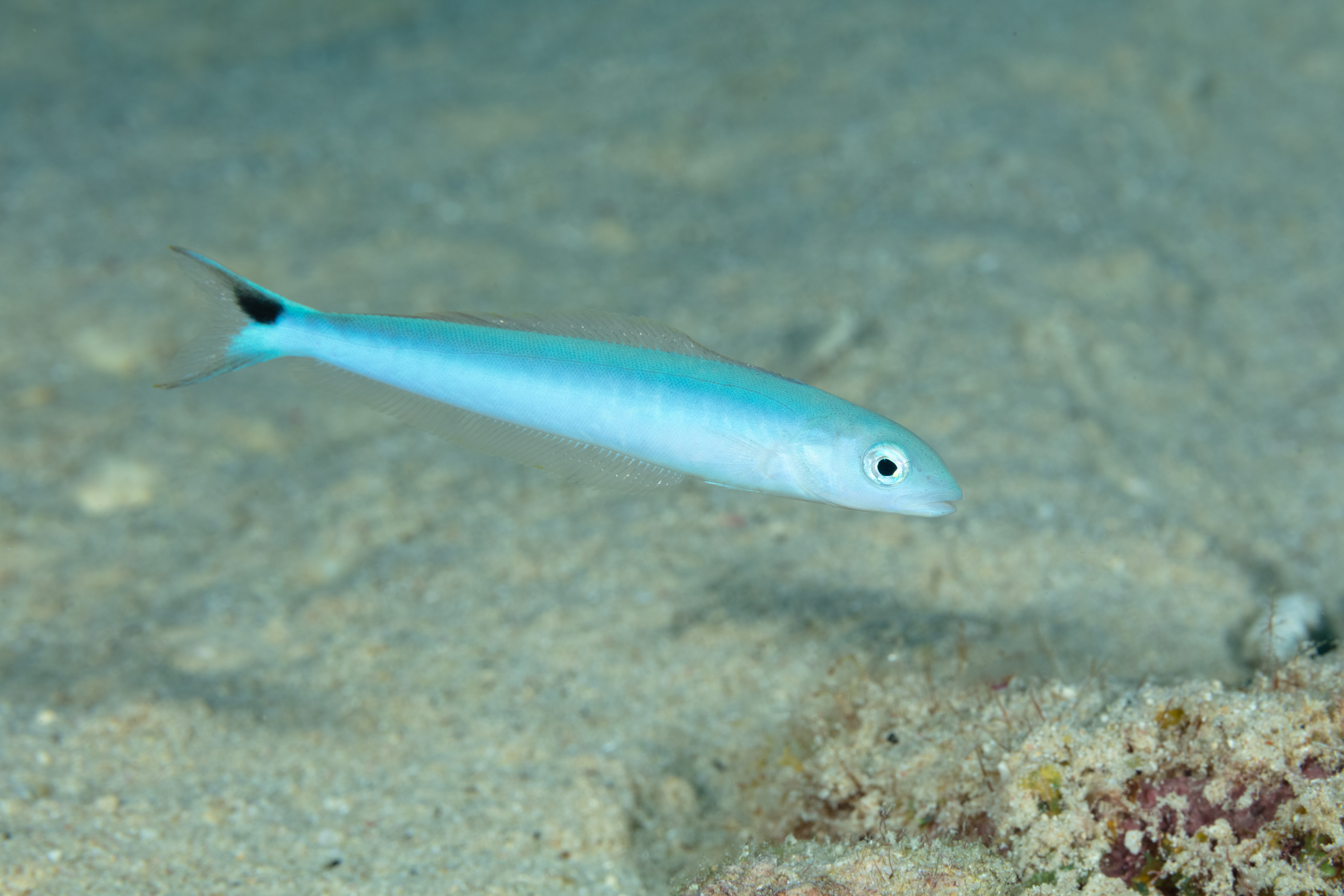 This Tilefish has a long, pale body that ranges from white to turquoise, sometimes with a light green tint. Its arched tail features a dark blotch near the upper center, its head has blue markings, and the tail often has a yellow hue.