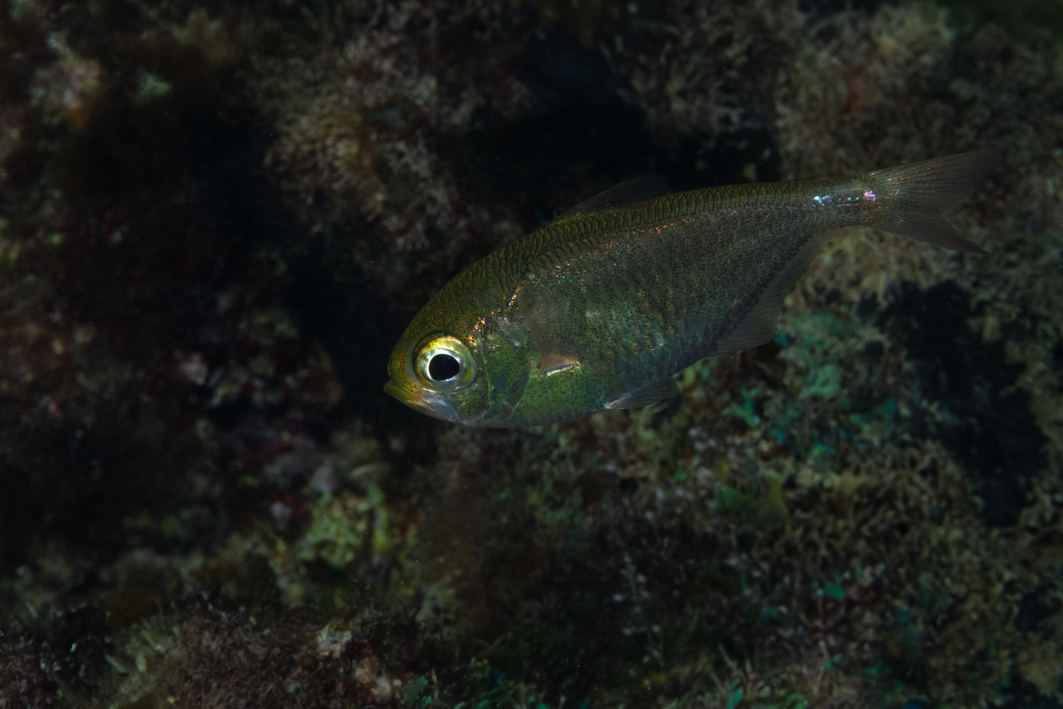 The Shortfin Sweeper is usually seen in groups inside caves or under ledges near the shore. At night, it leaves its shelter in schools to feed on zooplankton drifting in the water.