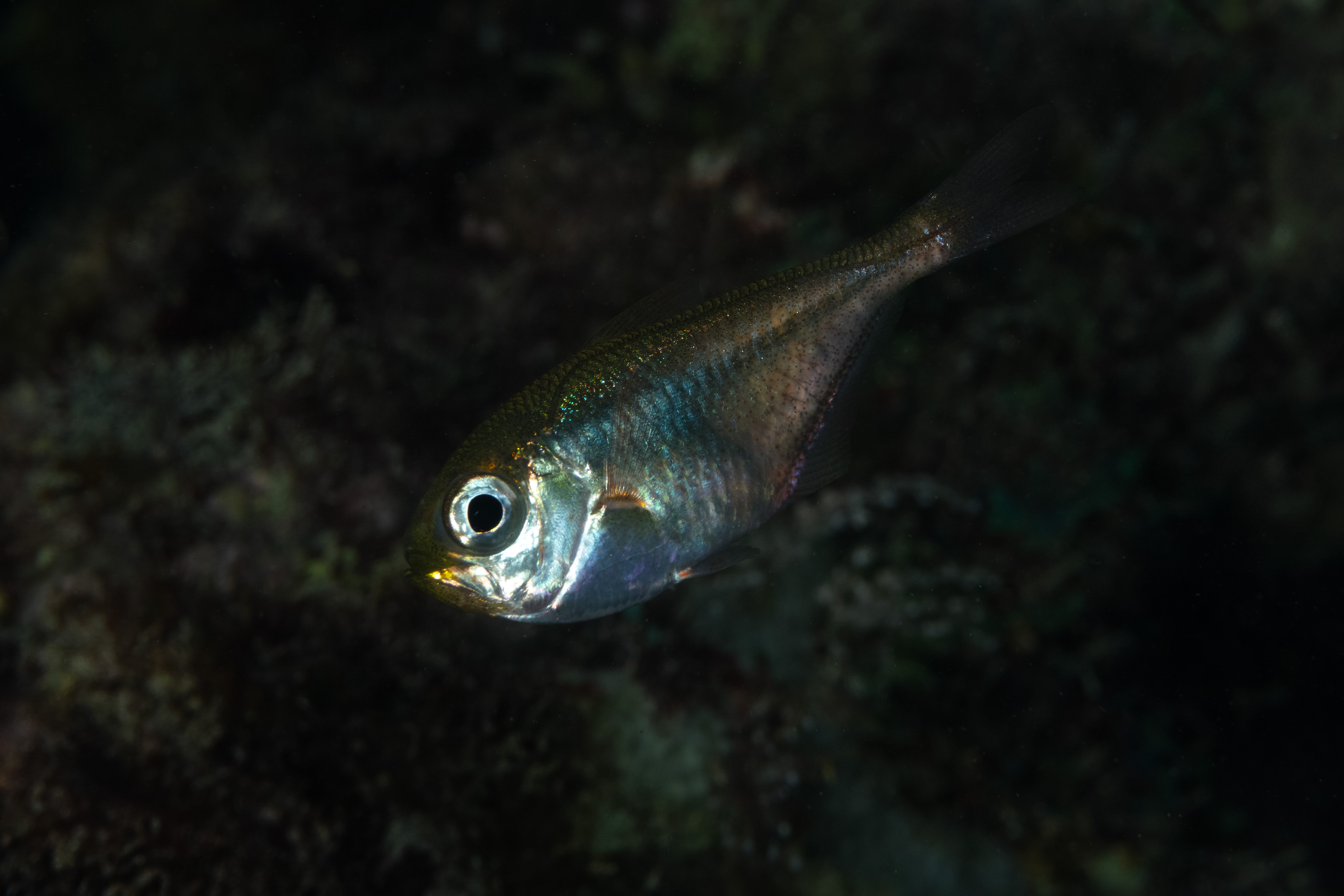 This Sweeper has a silver, gray, or dark green body shaped like a narrow teardrop. The body is deep and flat, with very large eyes and a sharply sloped belly. It can have a faint stripe at the base of its anal fin.