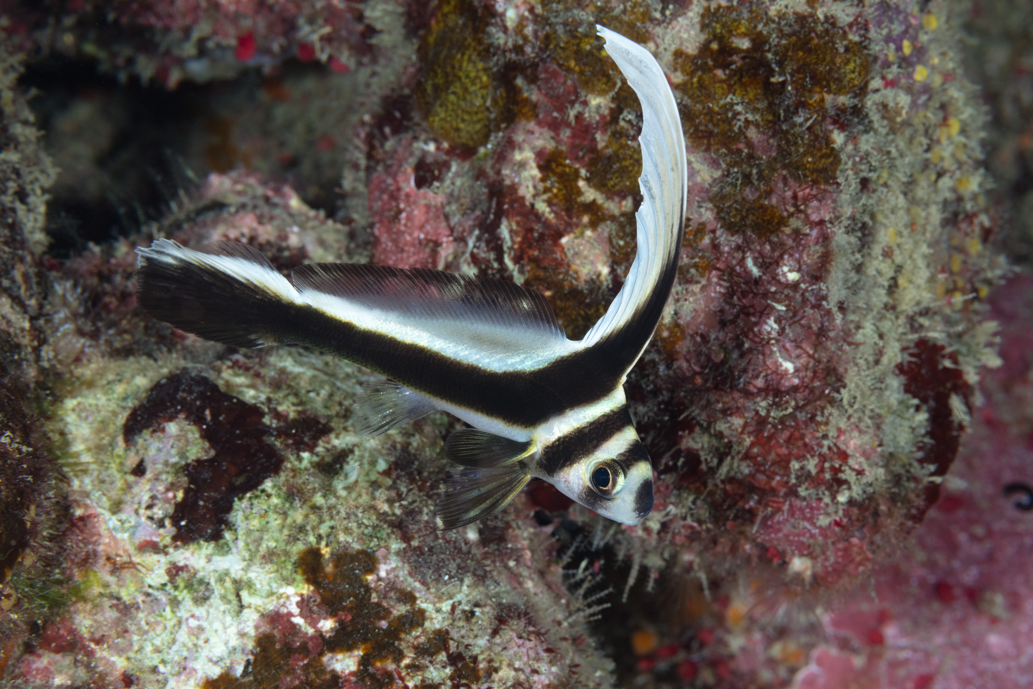 The Spotted Drum has black and white bars on its head and multiple stripes along its body. Its rear fins are black with white spots. Juveniles have a long dorsal fin, a single stripe along their body, and a dark spot on their nose.