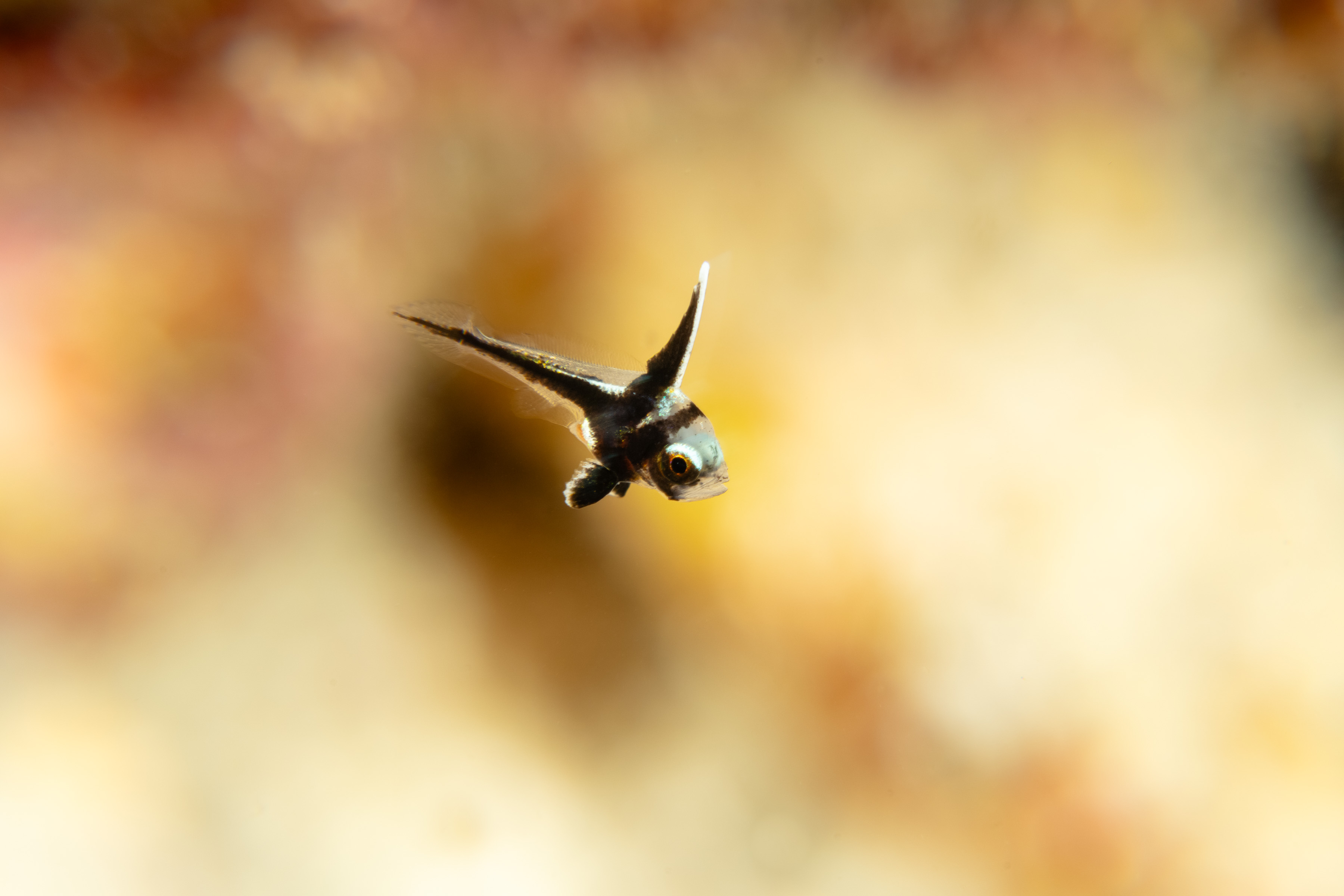 The Spotted Drum has black and white bars on its head and multiple stripes along its body. Its rear fins are black with white spots. Juveniles have a long dorsal fin, a single stripe along their body, and a dark spot on their nose.