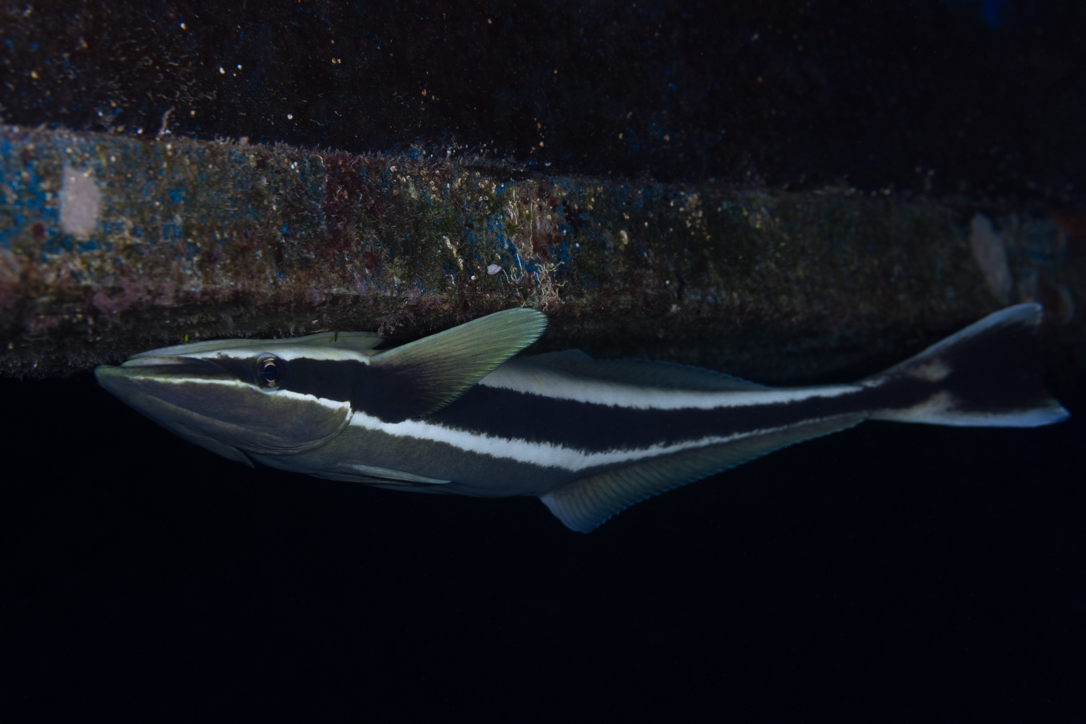 The Whitefin Sharksucker has a dark body with wide white borders along a black central stripe. The tail has thick white edges. The dorsal fin is shaped like a disc and is used to attach to hosts.