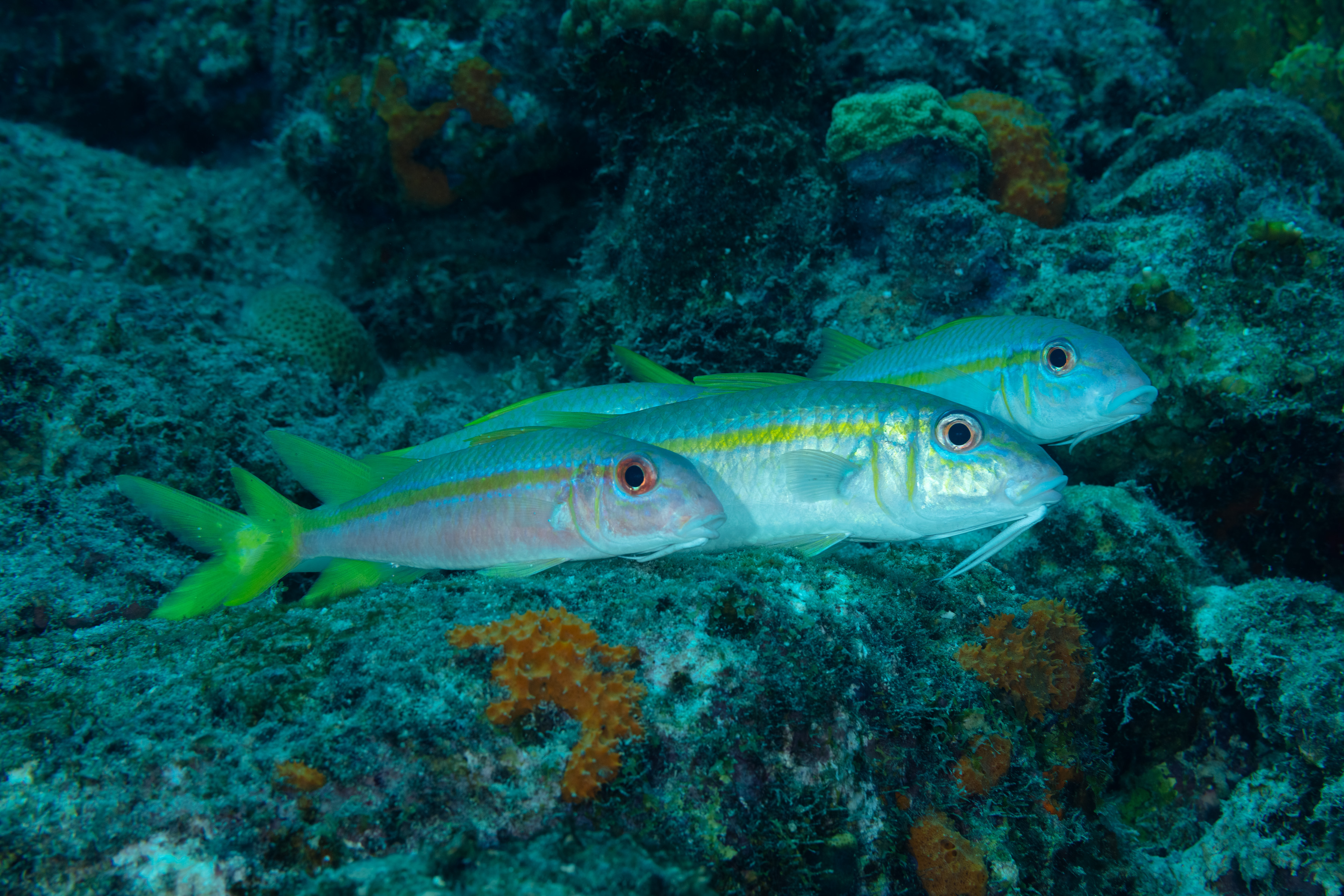 The Yellow Goatfish uses its barbels to search for food in sand and rubble. It is often seen alone or in small groups with other species and moves away when approached closely.