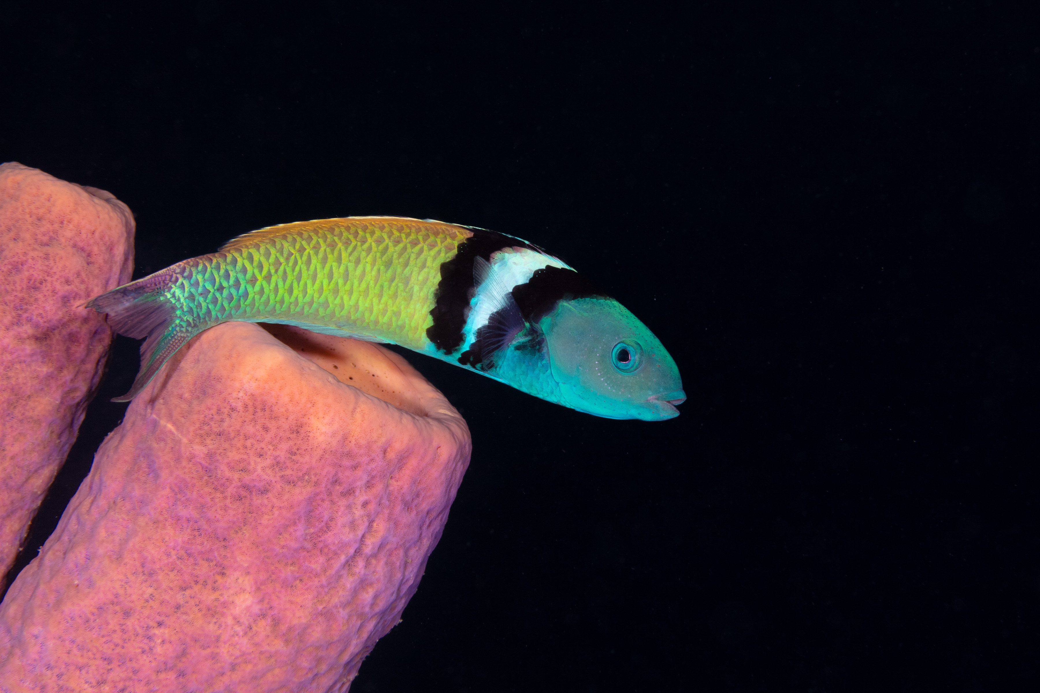 This Wrasse has a blue head with two dark bars behind it, separated by a pale bar. The back half of its body varies from yellow-green to bluish-green. In the intermediate phase, it has wide dark bars along the middle of its body, a white underside, and a black spot on its dorsal fin. In the initial and juvenile phases, its colors can vary, but it is often yellow with a black stripe running along the middle of its body and a black spot on the dorsal fin.