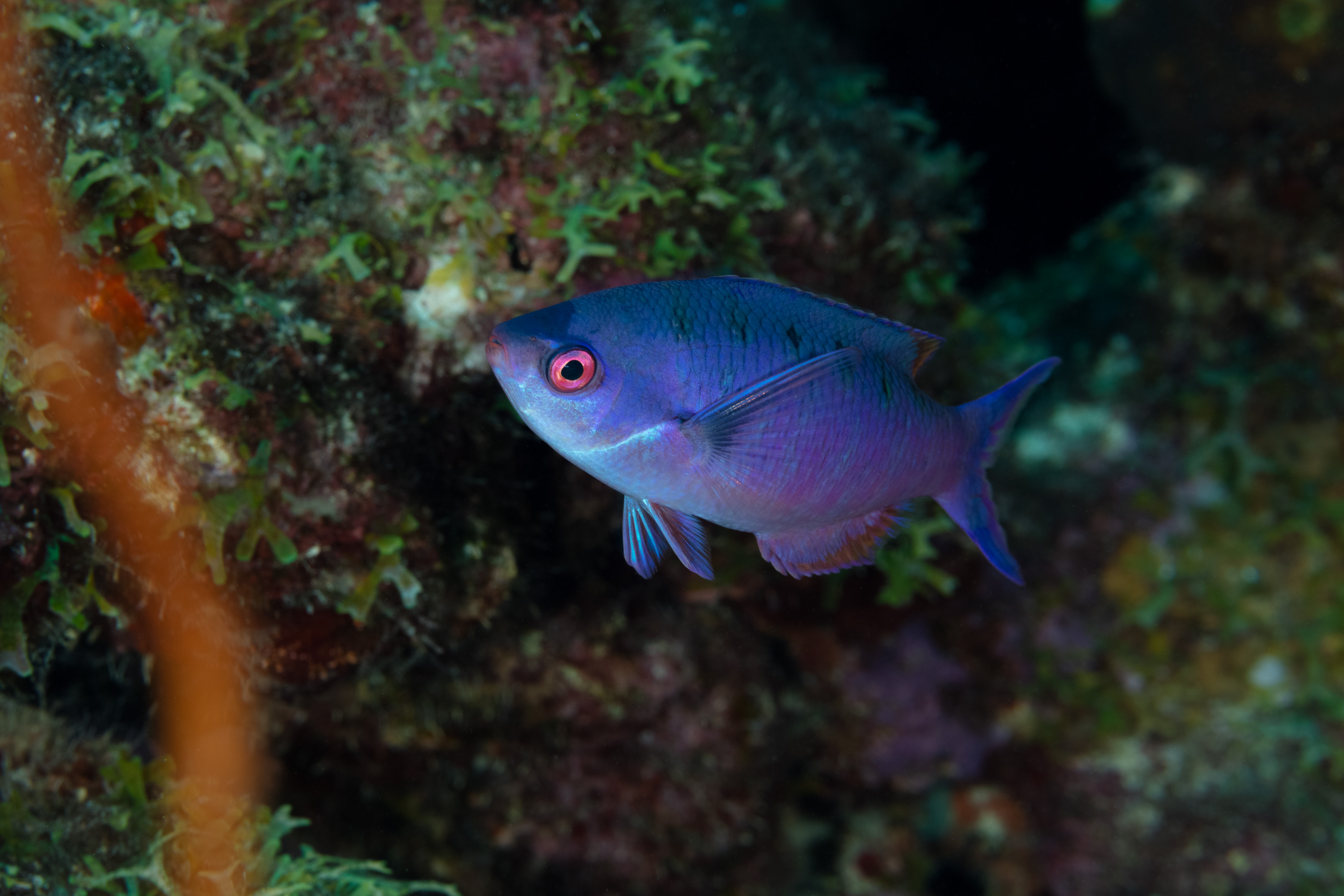 This Wrasse has a body that ranges from dark purple to lavender, with a darker shade on its upper snout. Juveniles are violet or grayish-blue, with rows of dark and light spots or short bands along the body.