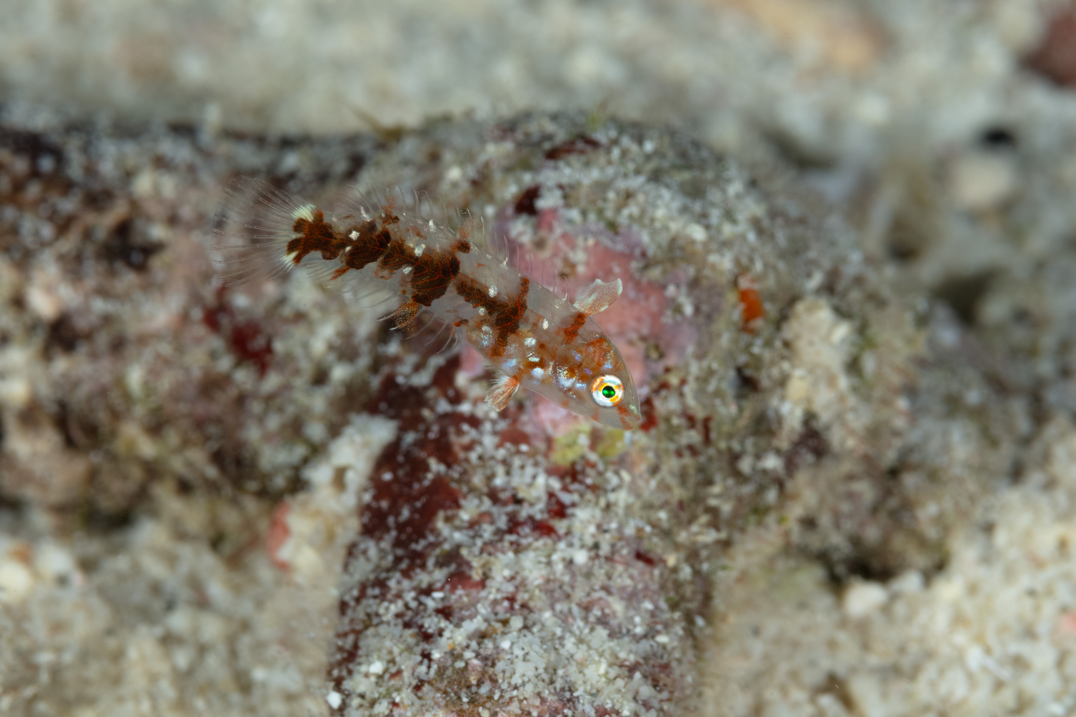 The males have a bluish-green to green body with a dark spot in the middle and bars on the lower head. The females range from green to reddish-brown. Juveniles vary greatly in color and markings, from solid colors to totally transparent, with dark bars that extend onto their fins.