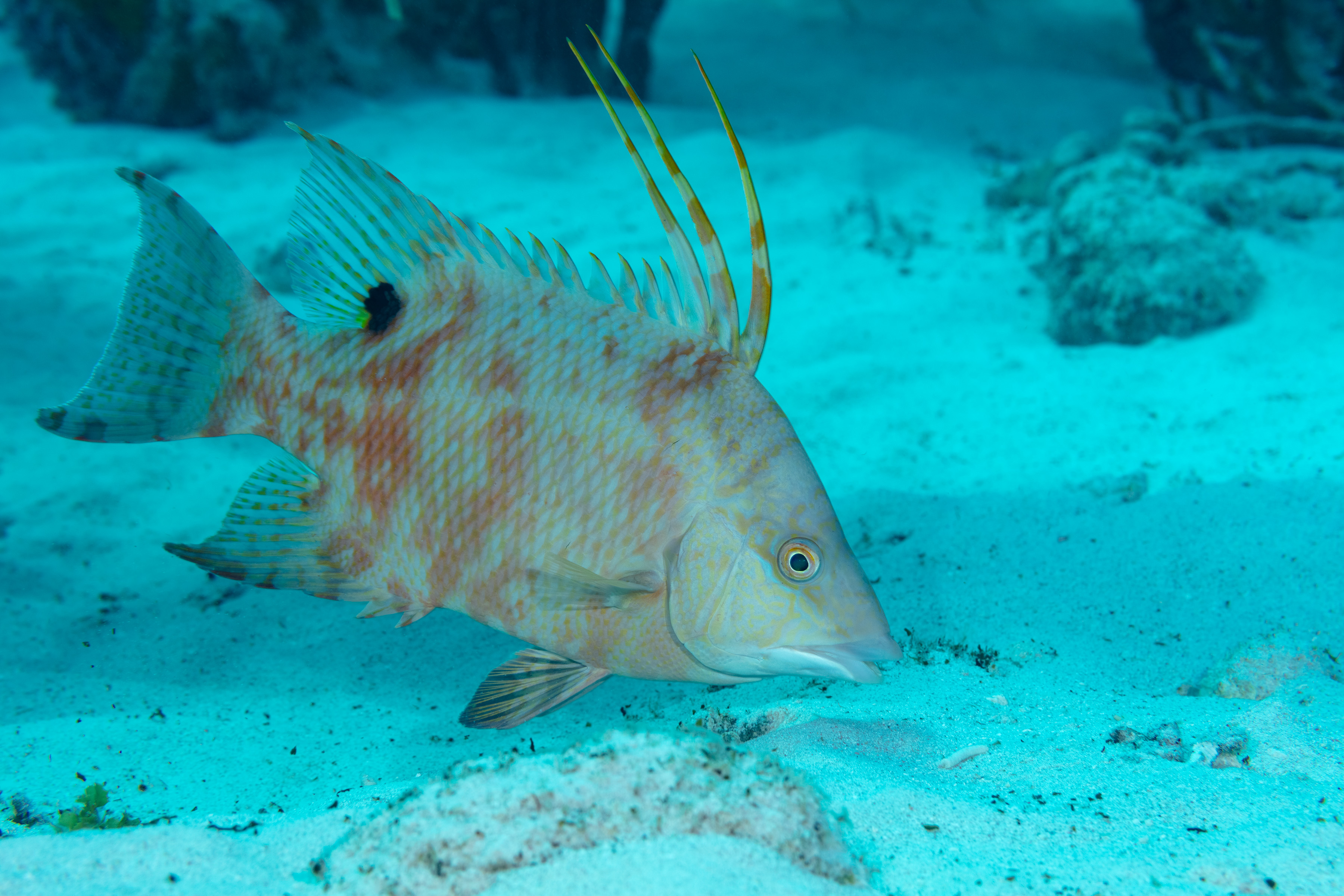 This large Hogfish has a reddish-brown or pale-white body and a dusky patch extends from its snout to the dorsal fin. It has three long spines at the front of its dorsal fin and a dark bar on its tail. A black spot near the tail is visible in smaller individuals but fades as they grow. Its coloration shifts while feeding, turning into a dappled orange-red pattern.