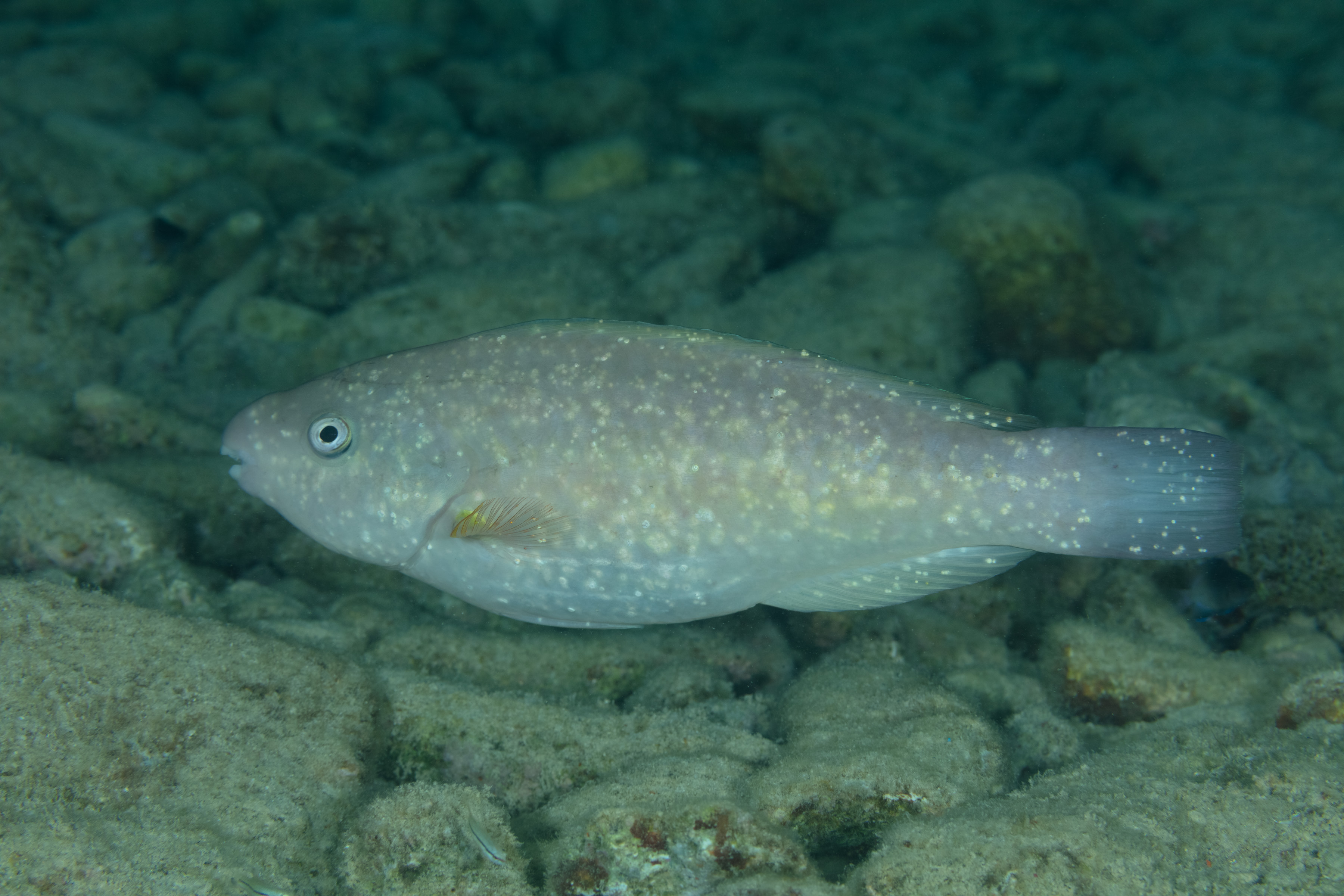 In this photo, the Princess Parrotfish has spots on its skin. Around Bonaire and Curaçao, these spots have been linked to parasites called Scaphanocephalus. These parasites form cysts under the skin, which appear as small pale spots.
