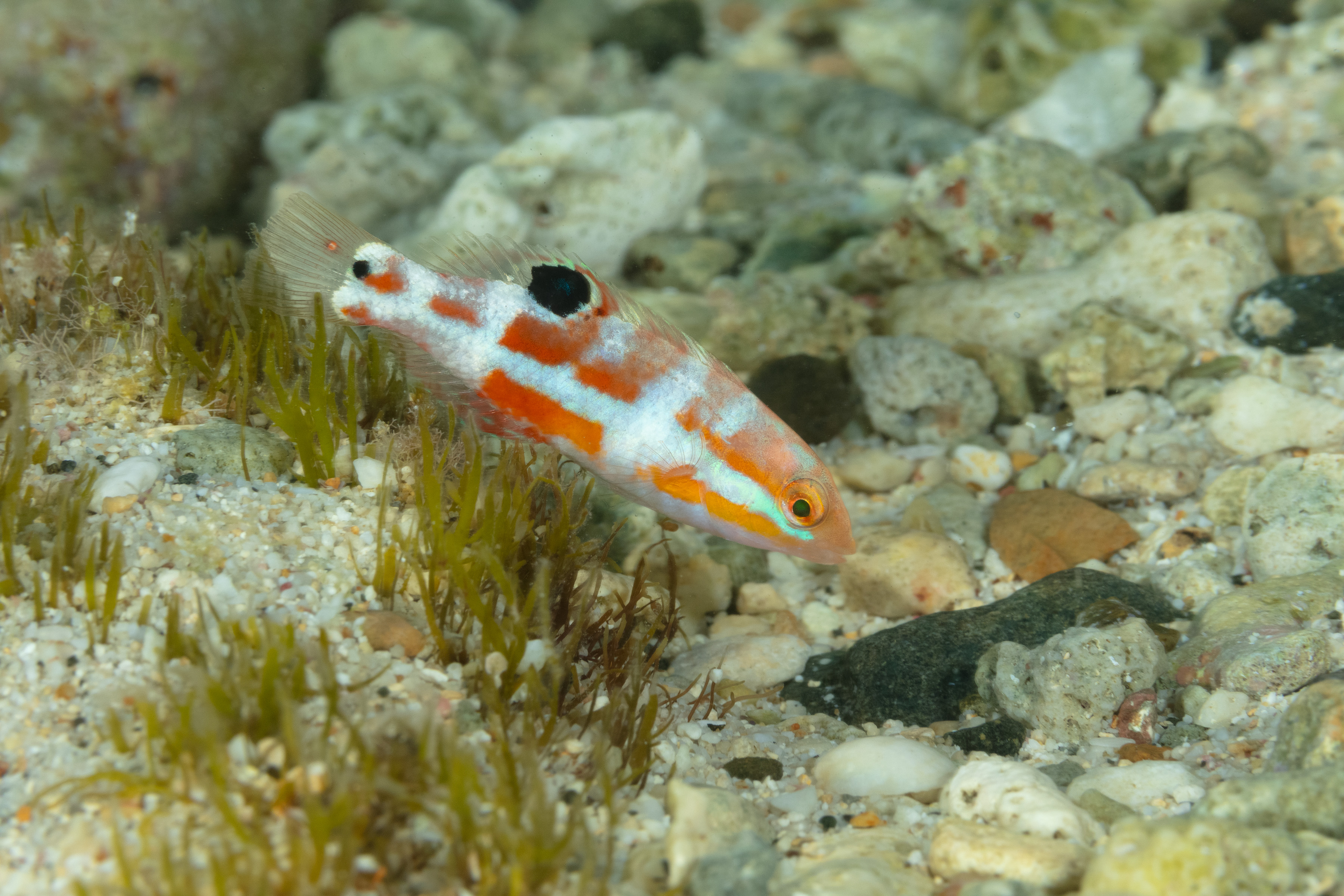 This Wrasse has a brownish-green body with several pale saddles along the back. Its head has numerous blue lines radiating from the eye. Juveniles have an orange-yellow body with a stripe running from below the eye to the base of the tail and bars on the upper body. A large black spot is located on the dorsal fin, extending onto the upper body, and another black spot is on the upper tail base.