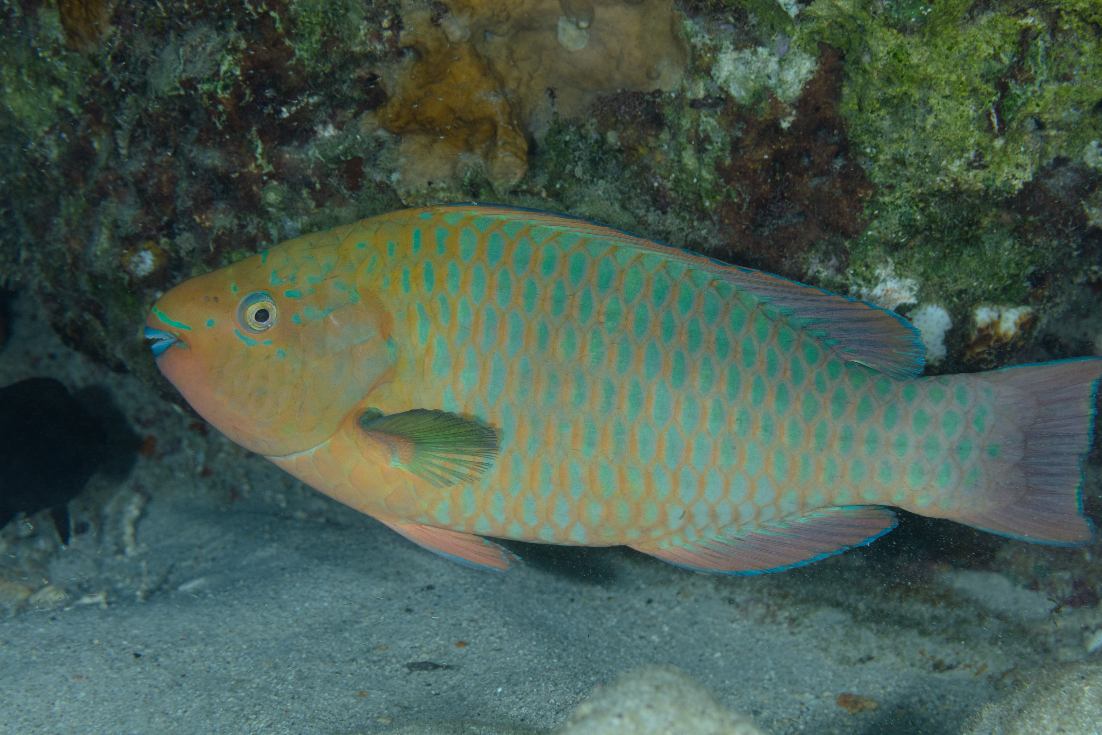 The Rainbow Parrotfish is usually found in shallow waters near rocky shorelines, where it scrapes algae from rocks and dead coral.