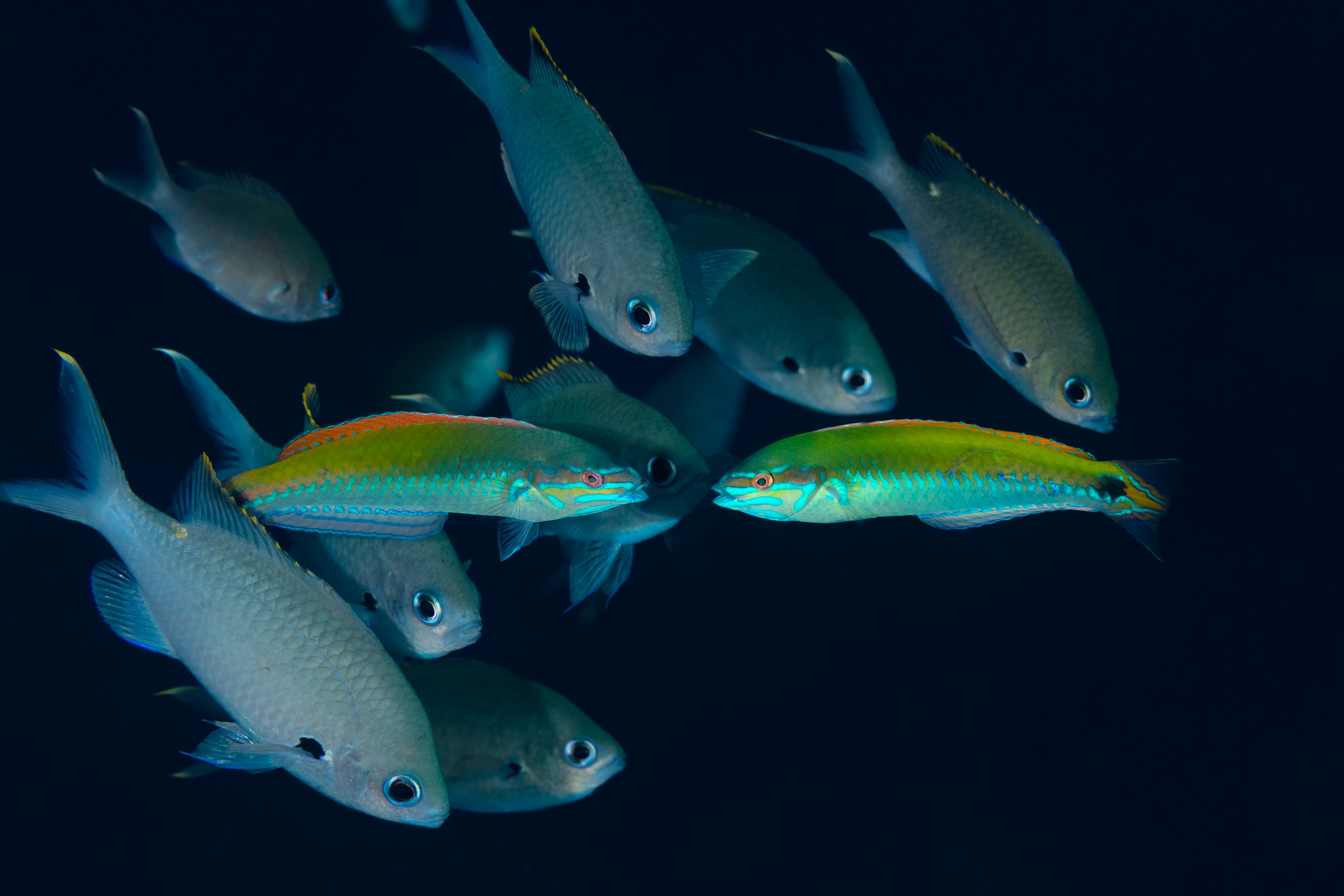 This Wrasse has a blue-green to green upper body with a bluish stripe along its midsection and a pale blue underside. Its head has blue stripes above and below the eye, a black spot at the base of the tail, and an orange dorsal fin.