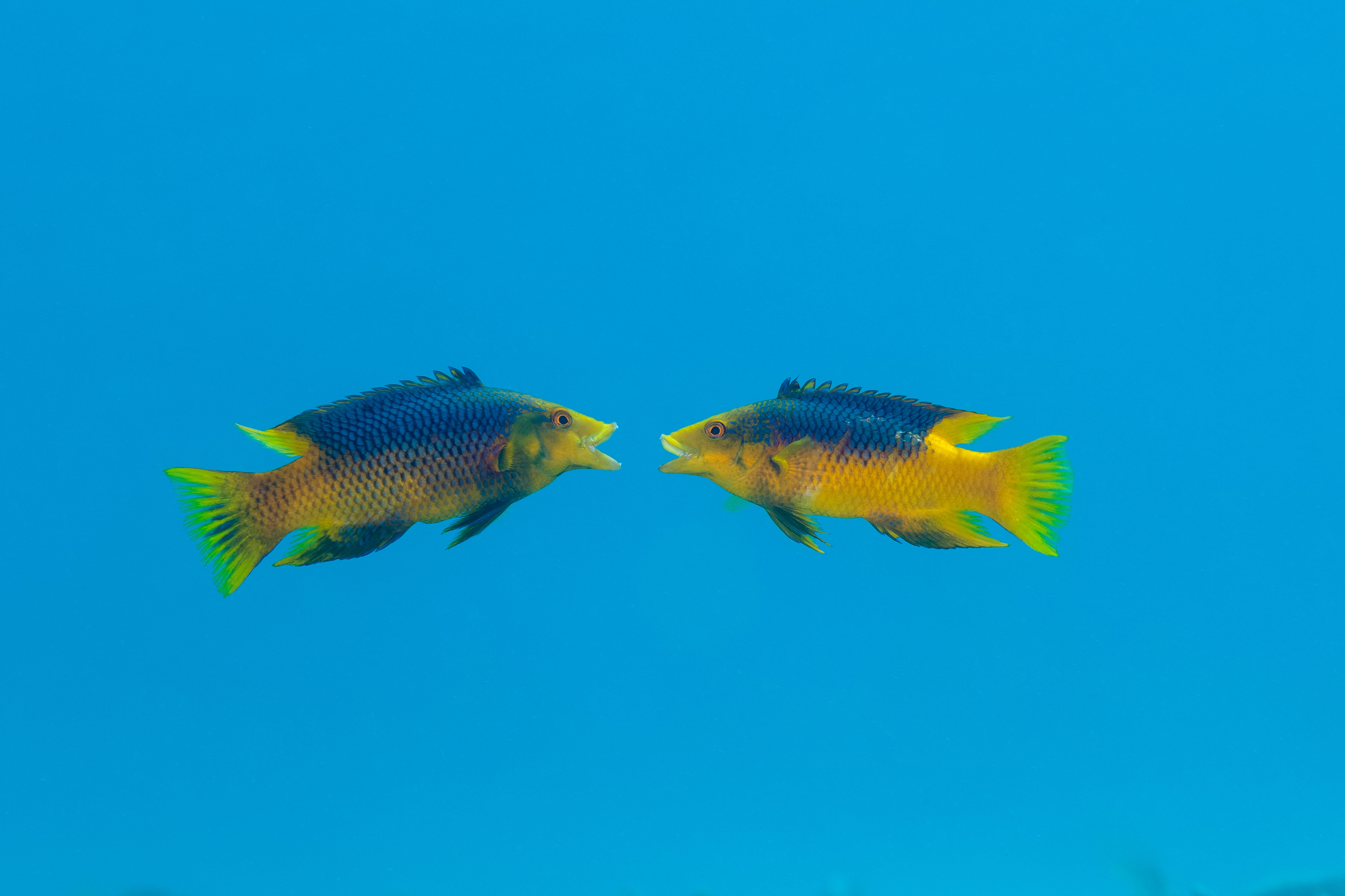 Young Spanish Hogfish face off with open mouths to challenge one another.