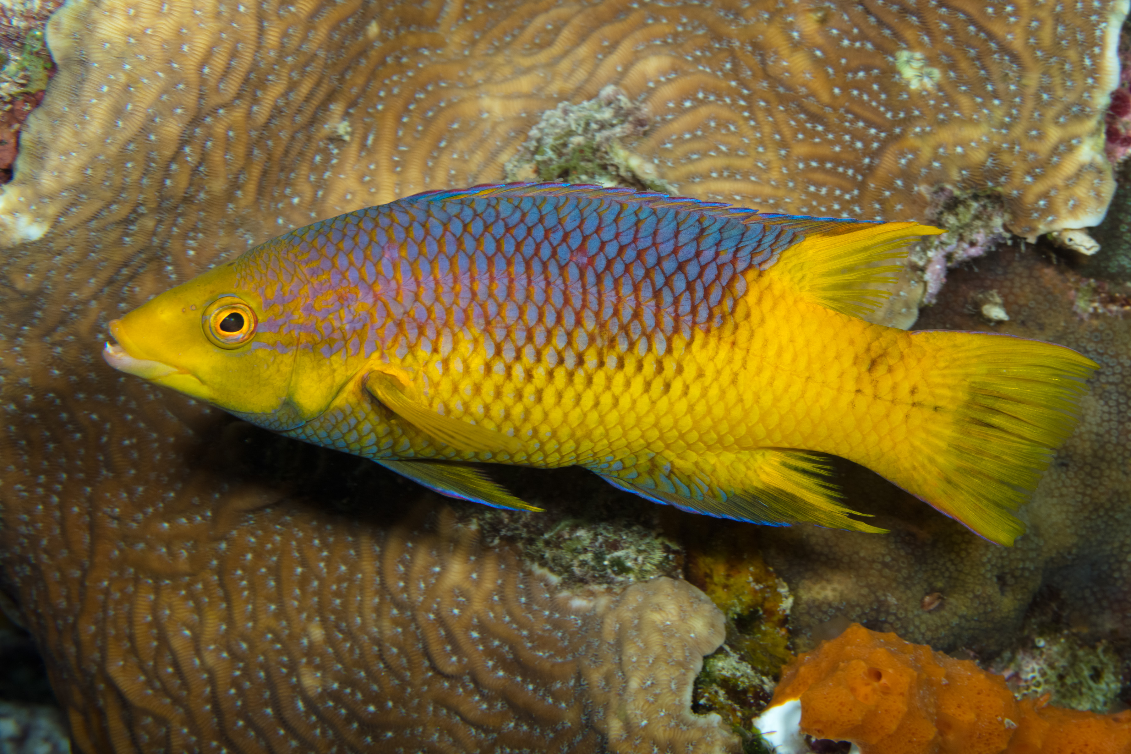 This Hogfish has a yellow body with a purple-blue upper forebody. Some individuals may show more brown or dark blue tones instead of the usual coloration.