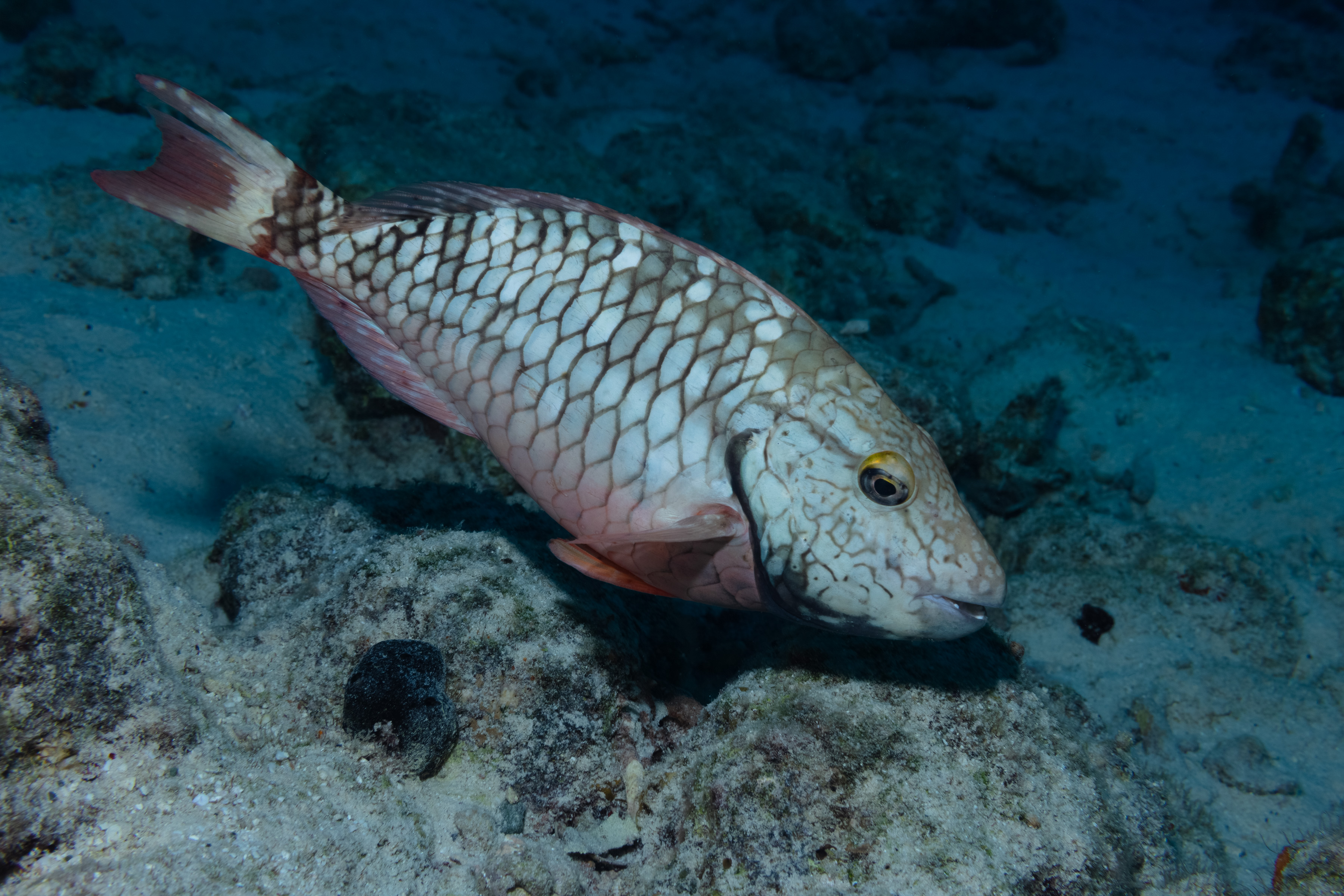 The Stoplight Parrotfish is most active during the day, feeding on algae by scraping it from rocks and dead coral using its strong beak-like teeth
