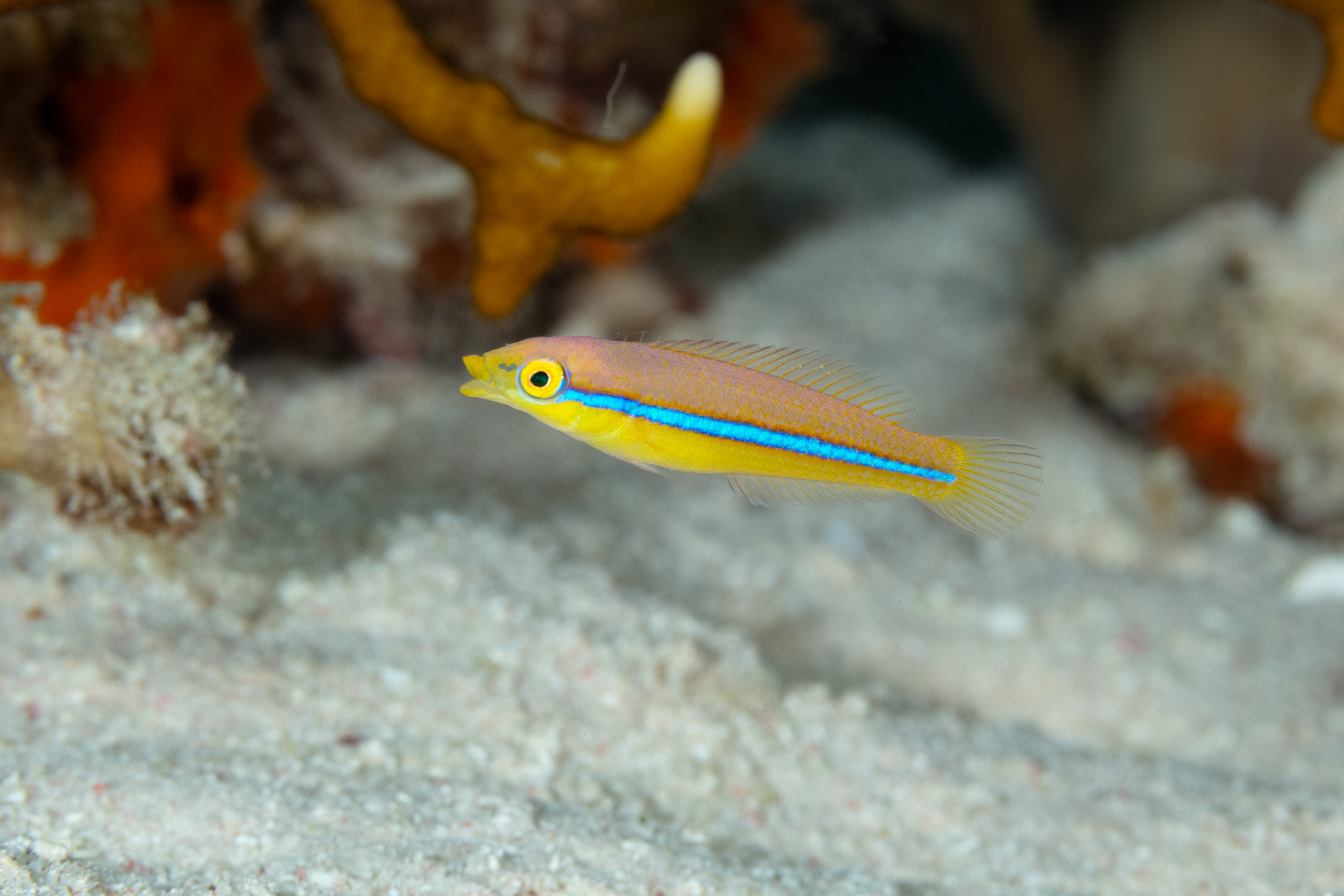 This Wrasse has a yellow head with a dark midbody bar that connects to a stripe running below the dorsal fin and extending to the tail. Two wavy lines extend from the upper rear of the eye. In the initial phase, the head and upper back are dark, while the sides show shades of yellow. The tail has wavy blue lines. Juveniles have a bright yellow body with a blue midbody stripe.