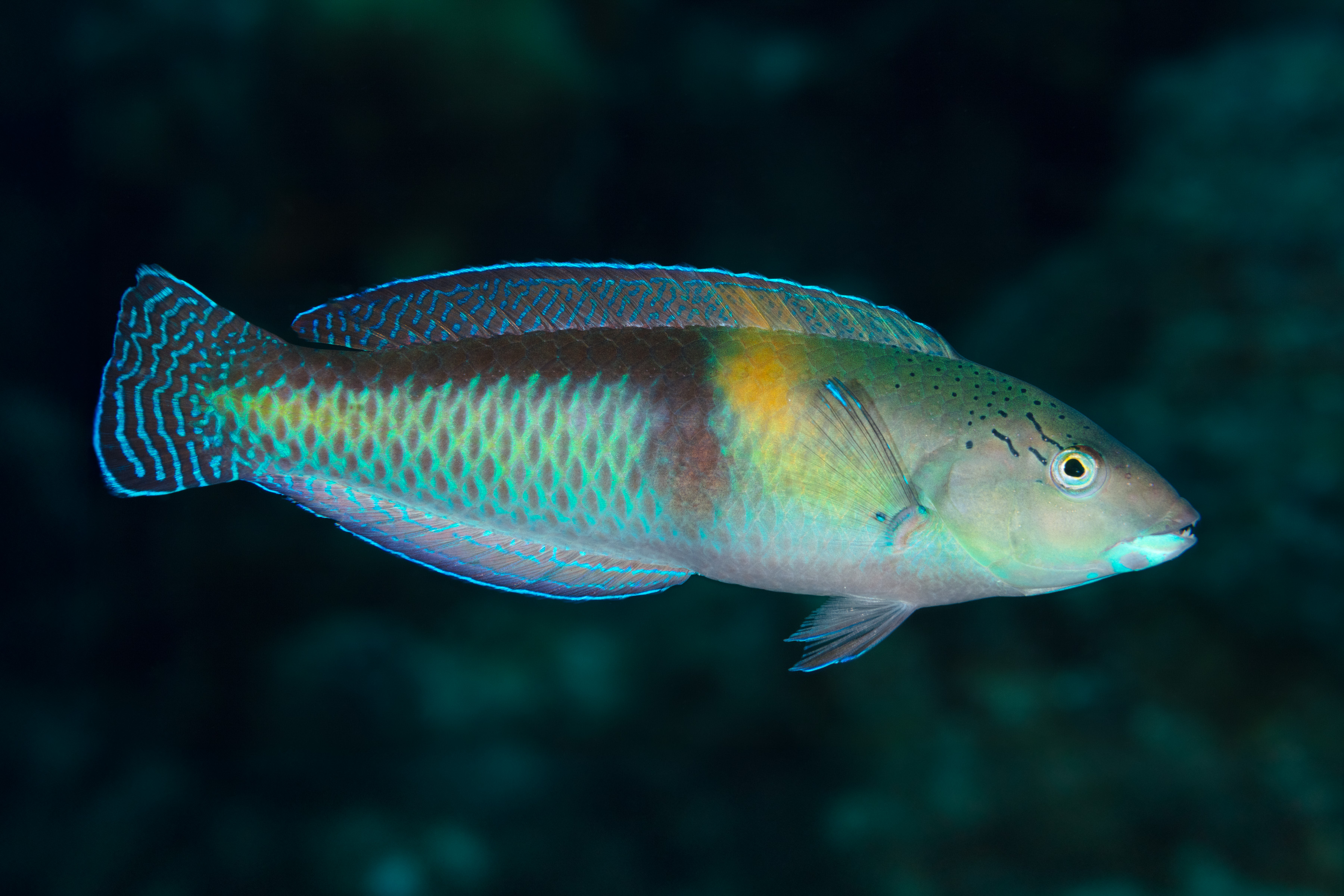 This Wrasse has a yellow head with a dark midbody bar that connects to a stripe running below the dorsal fin and extending to the tail. Two wavy lines extend from the upper rear of the eye. In the initial phase, the head and upper back are dark, while the sides show shades of yellow. The tail has wavy blue lines. Juveniles have a bright yellow body with a blue midbody stripe.