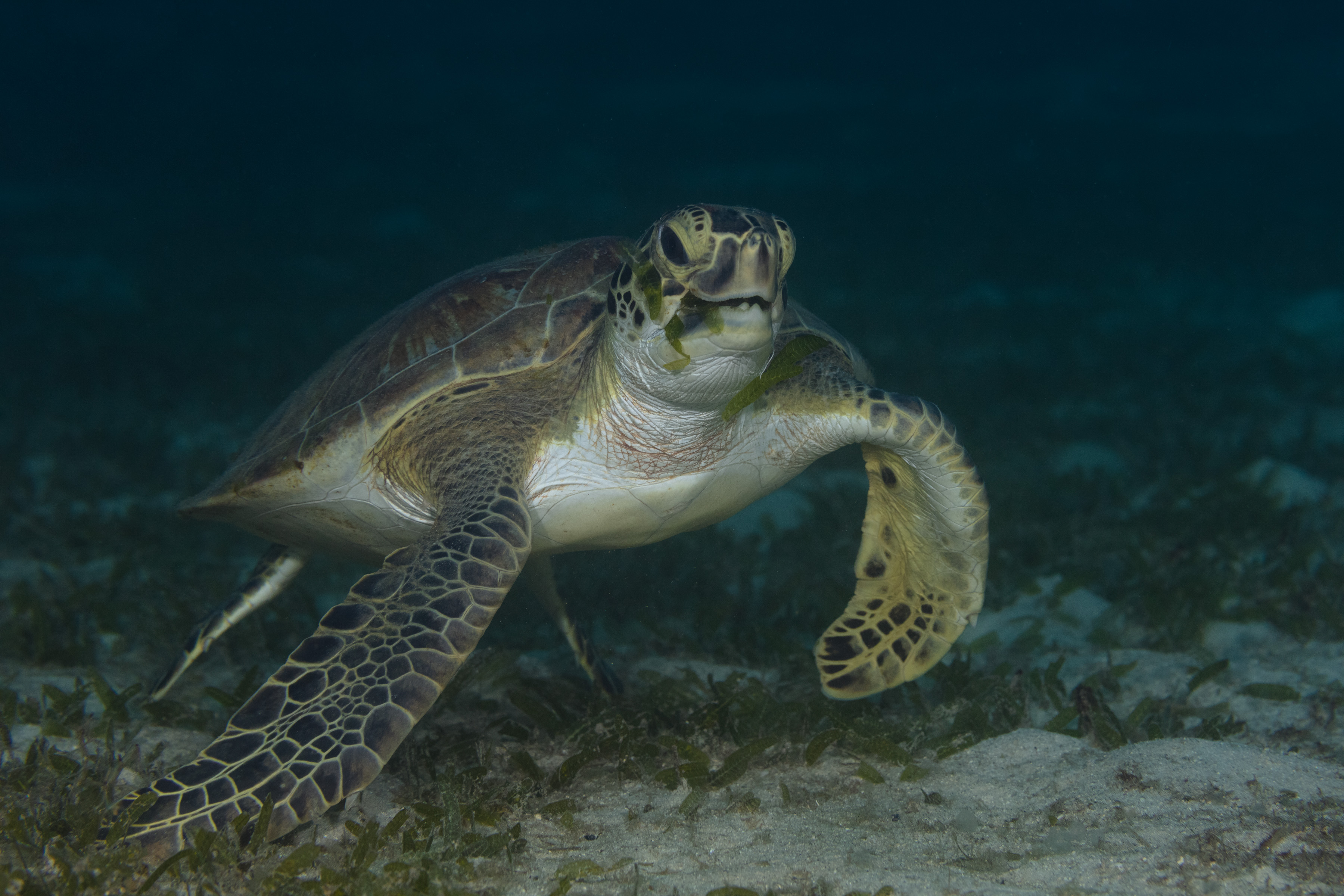 The Green Sea Turtle primarily feeds on seagrass and occasionally on jellies. When active, it surfaces every few minutes to breathe, but while resting, it can stay underwater for up to six hours. It spends nearly its entire life in the water, with females coming ashore only every few years to lay eggs, always returning to where they were born. Its population has declined sharply due to hunting, habitat loss, and plastic pollution.