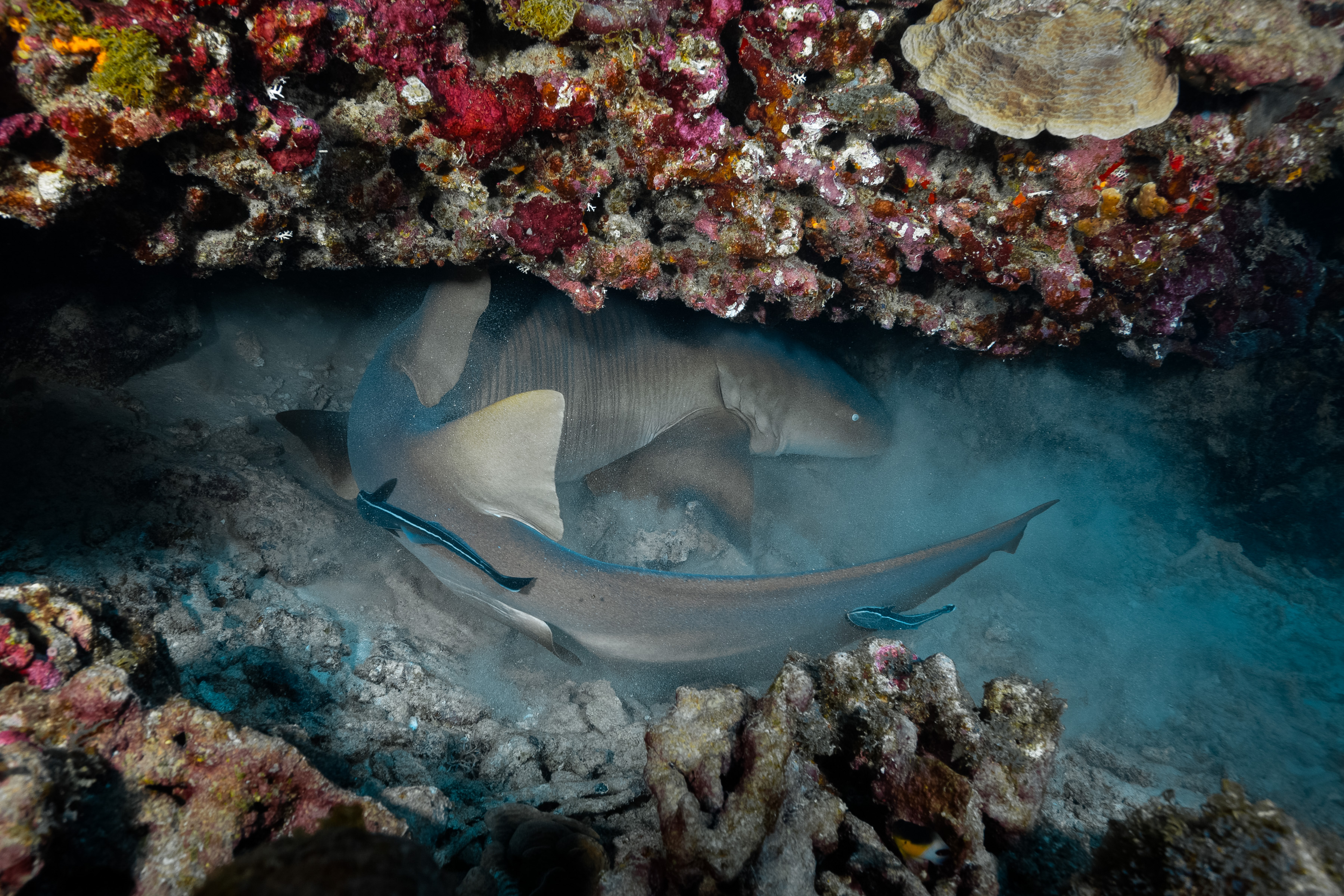 The Nurse Shark is often found resting motionless on sandy bottoms or under ledges during the day, becoming active at night to hunt.