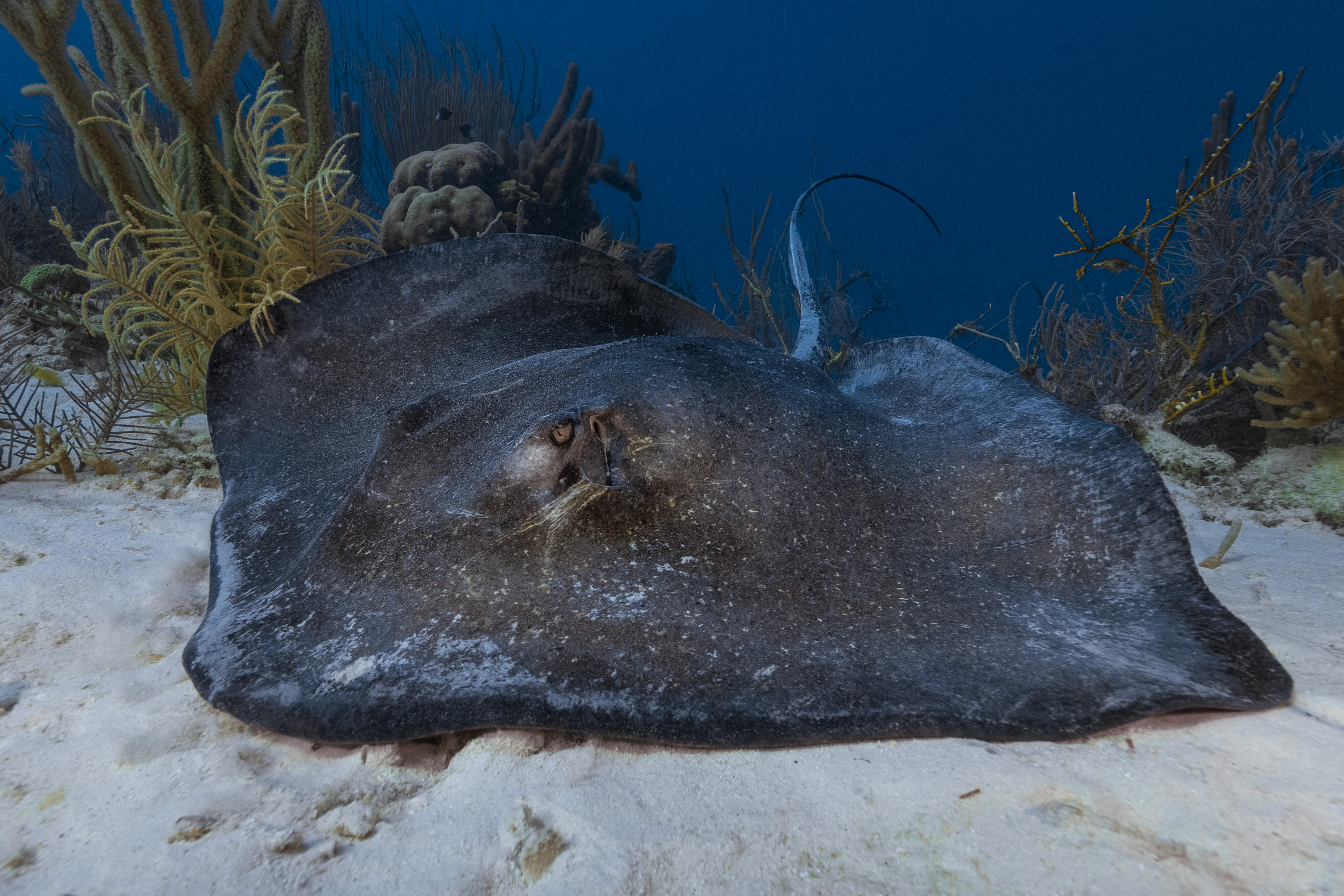The Southern Stingray is typically found on sandy areas, often lying partially buried. When approached by divers, it usually remains motionless unless disturbed.