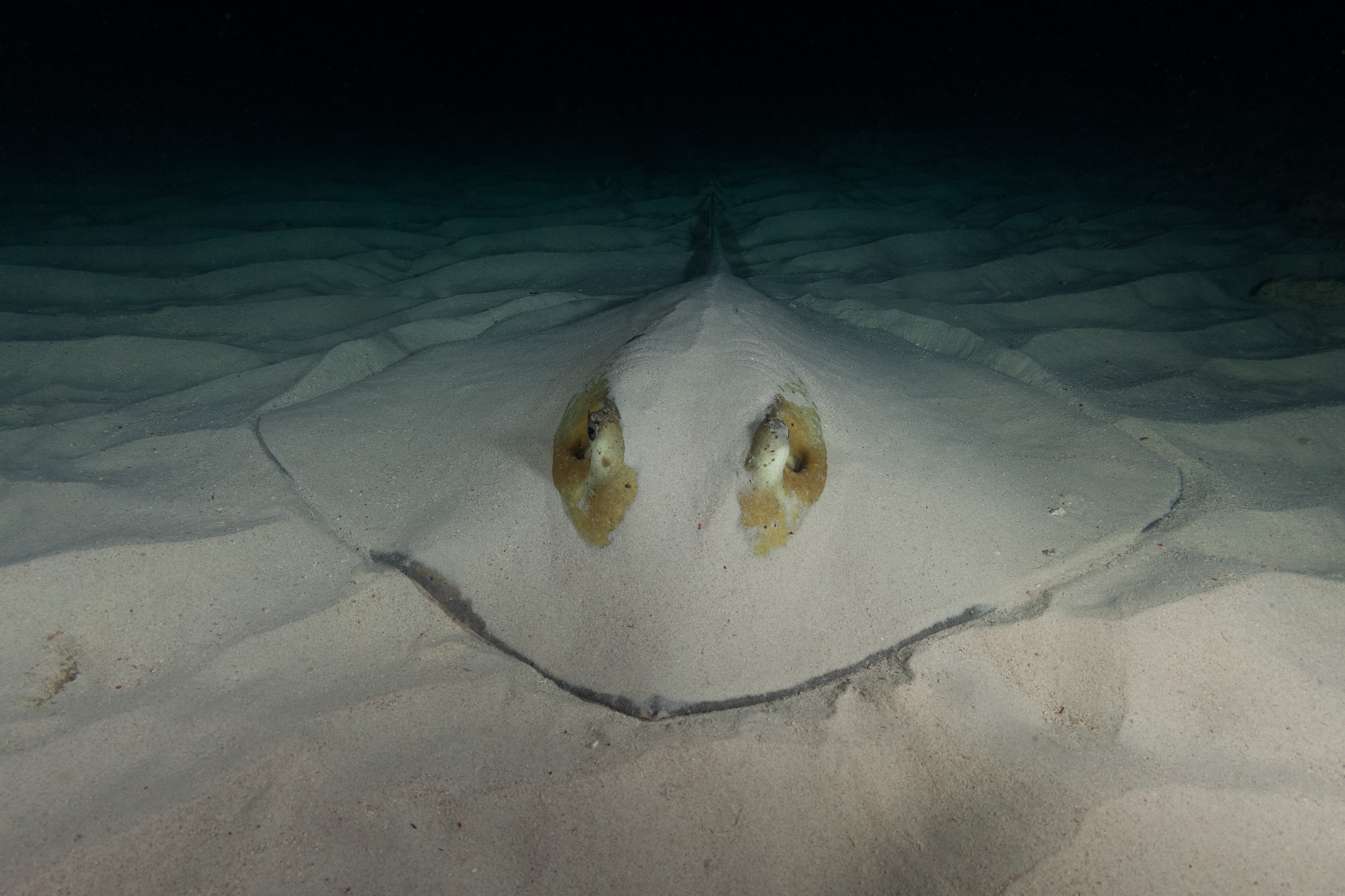 The Southern Stingray is typically found on sandy areas, often lying partially buried. When approached by divers, it usually remains motionless unless disturbed.