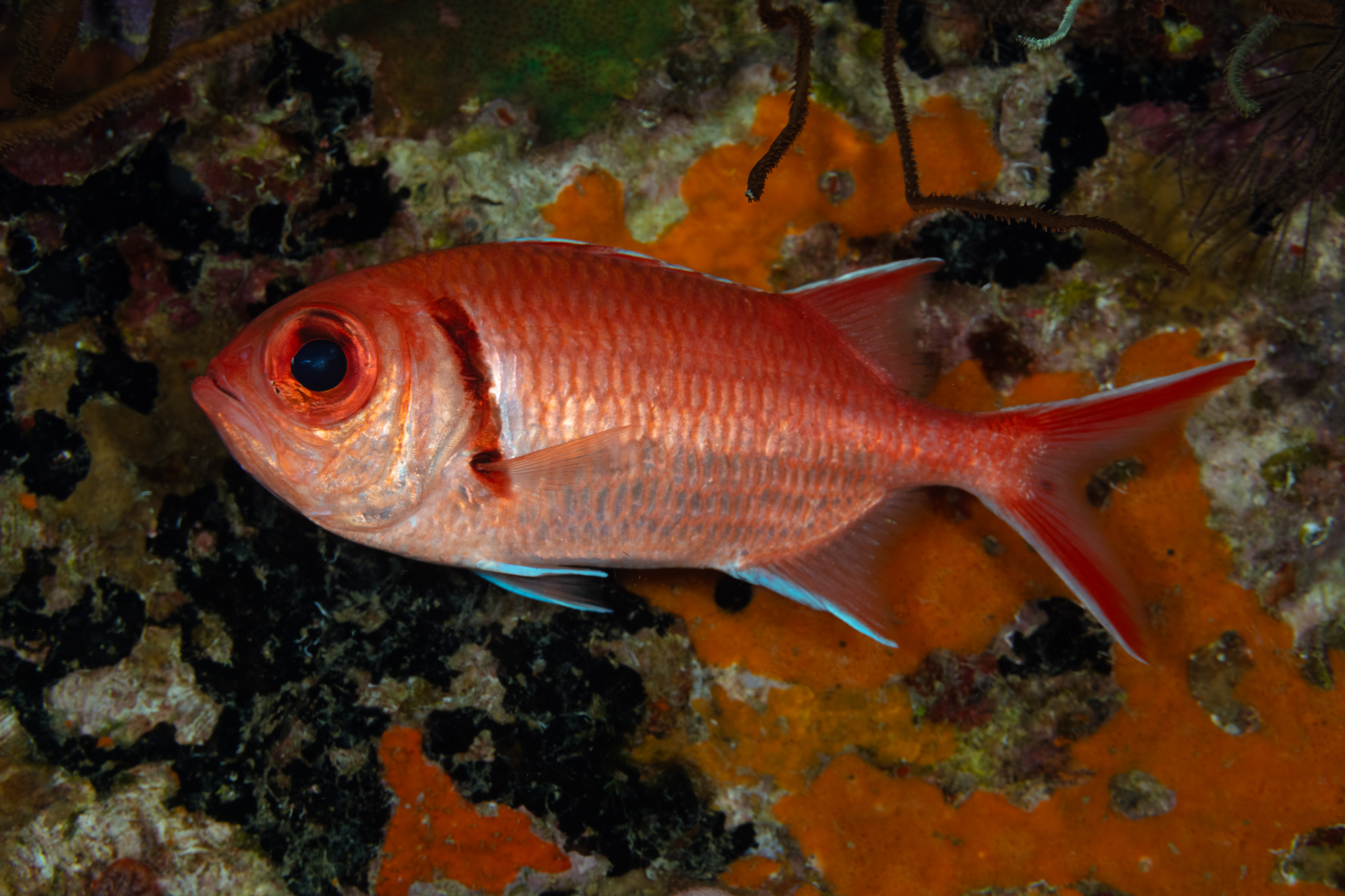 This Soldierfish has a bright red body with a broad black bar behind the head, and its fins have white edges.
