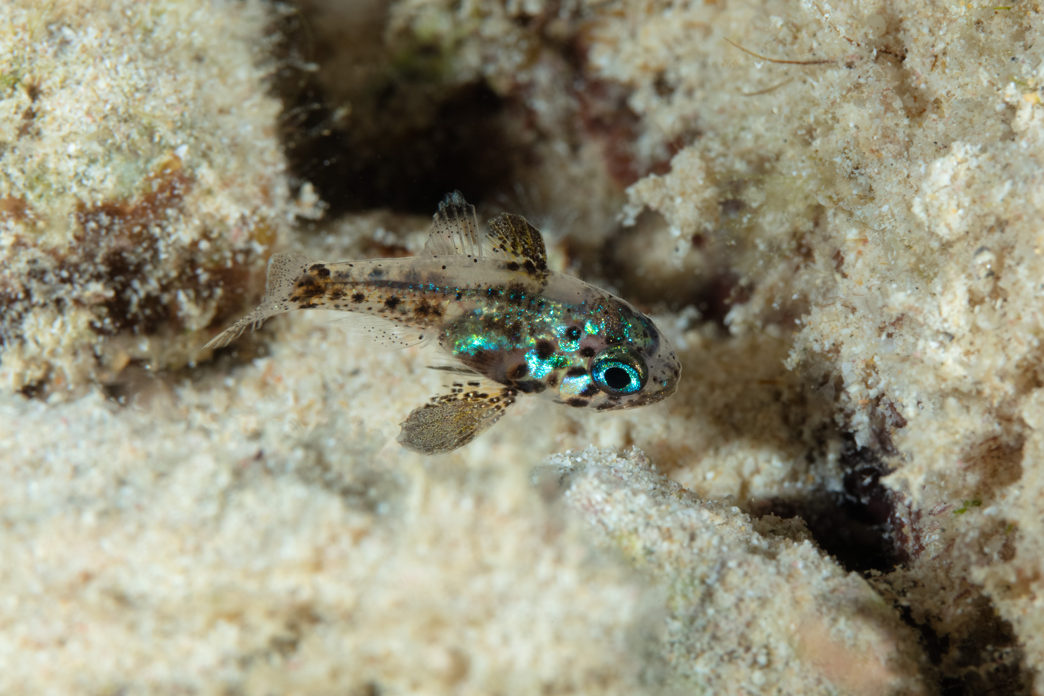 This Cardinalfish has a transparent brownish body speckled with dark spots and colorful highlights. Its fins are large, and its ventral fins are dark gray to black.