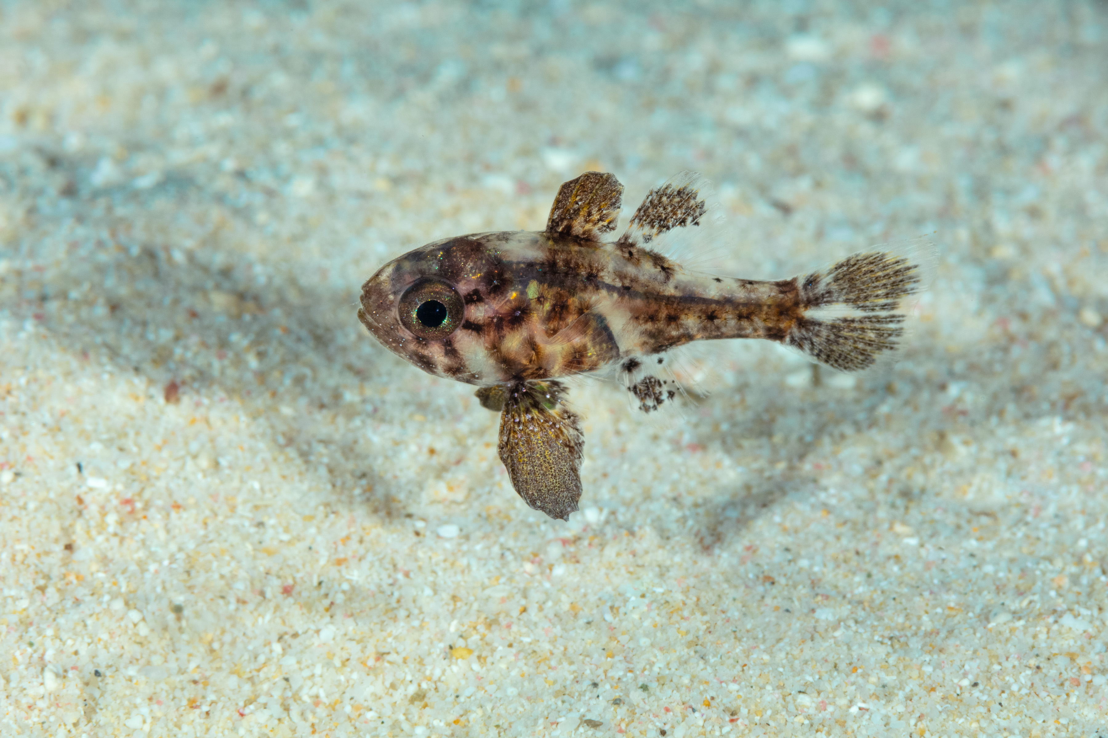 This Cardinalfish has a transparent brownish body speckled with dark spots and colorful highlights. Its fins are large, and its ventral fins are dark gray to black.
