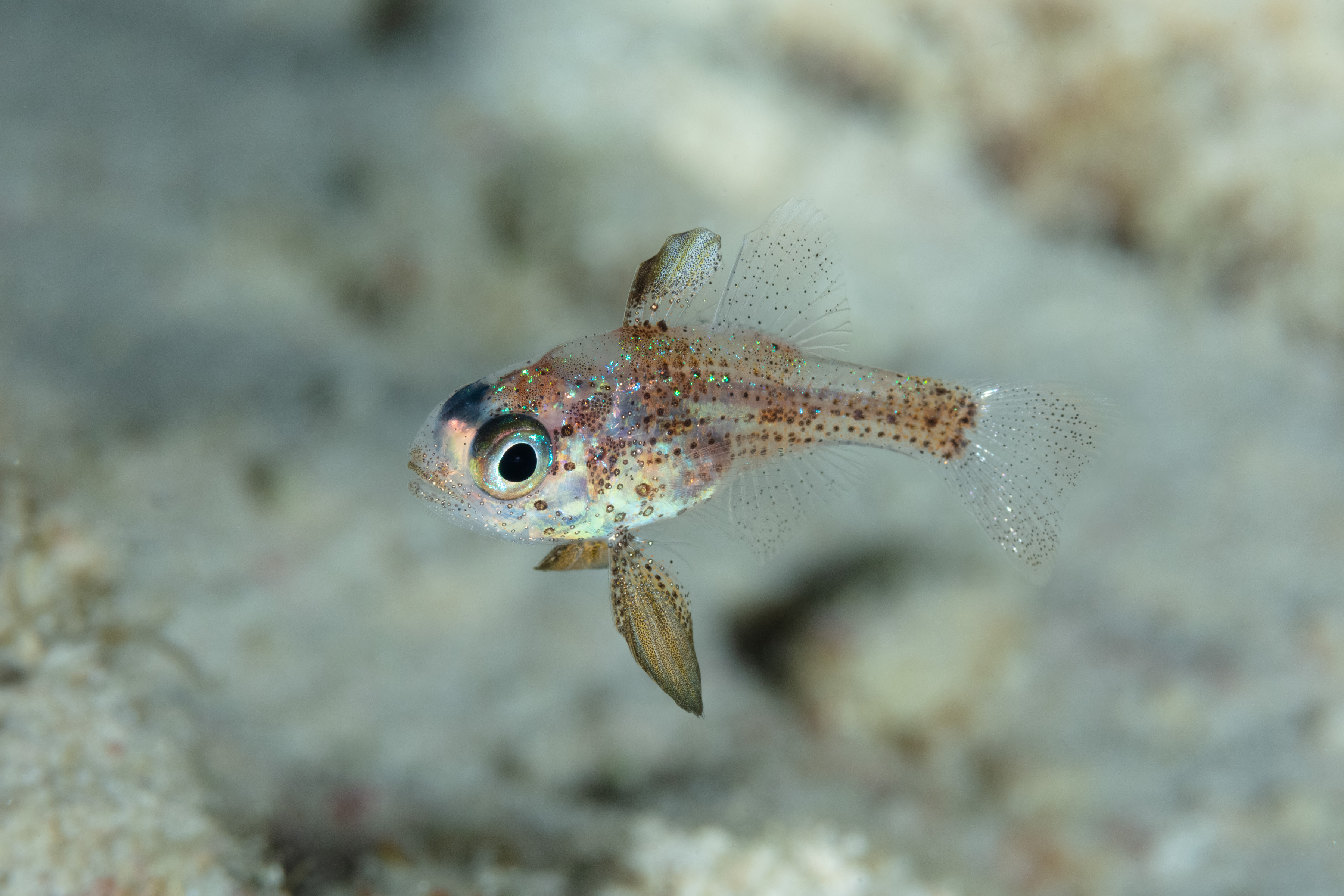 This Cardinalfish has a transparent brownish body speckled with dark spots and colorful highlights. Its fins are large, and its ventral fins are dark gray to black.