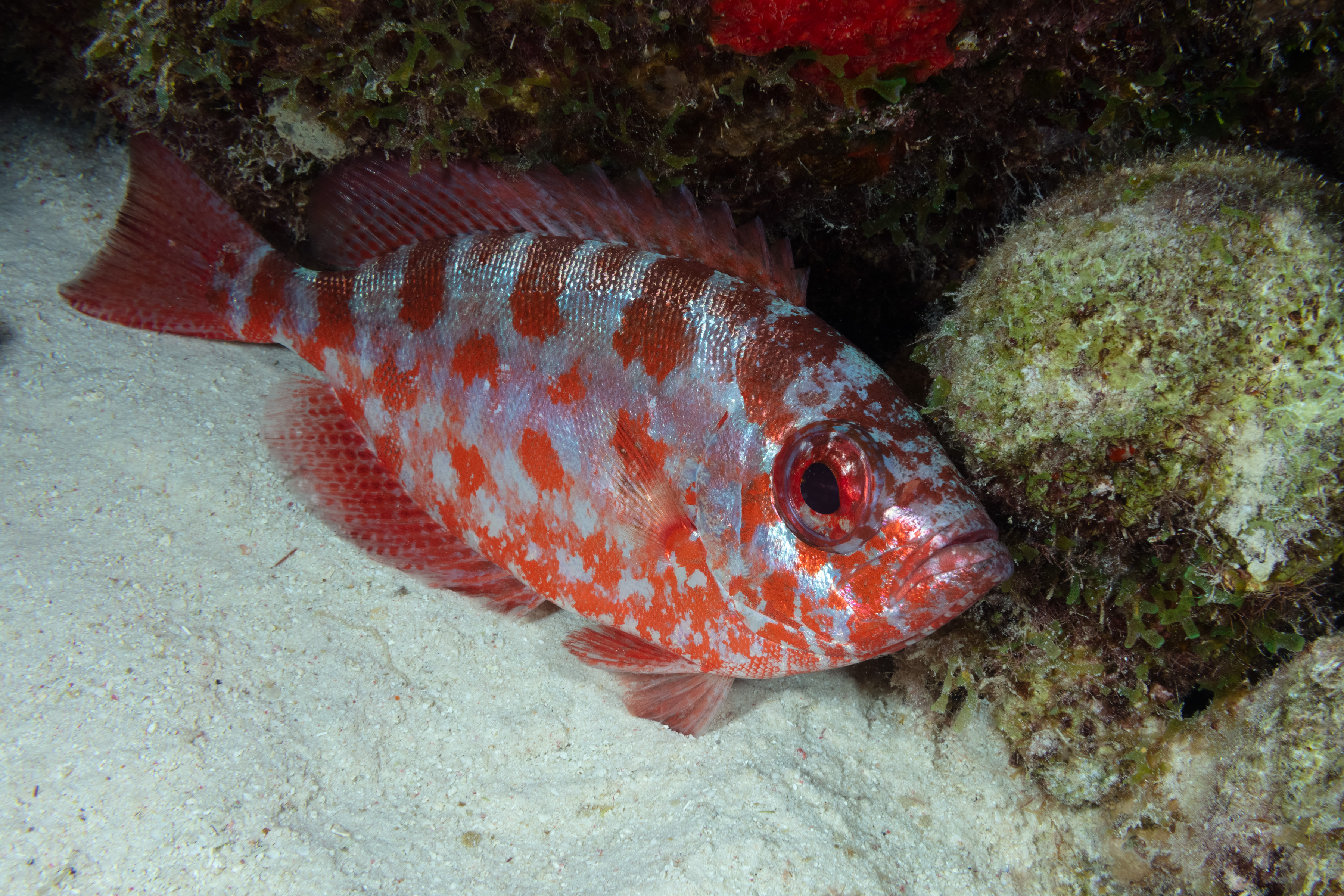 This Bigeye has a red body with faint silver blotches and silver bars on its back. Its fins are covered with small dark red spots.