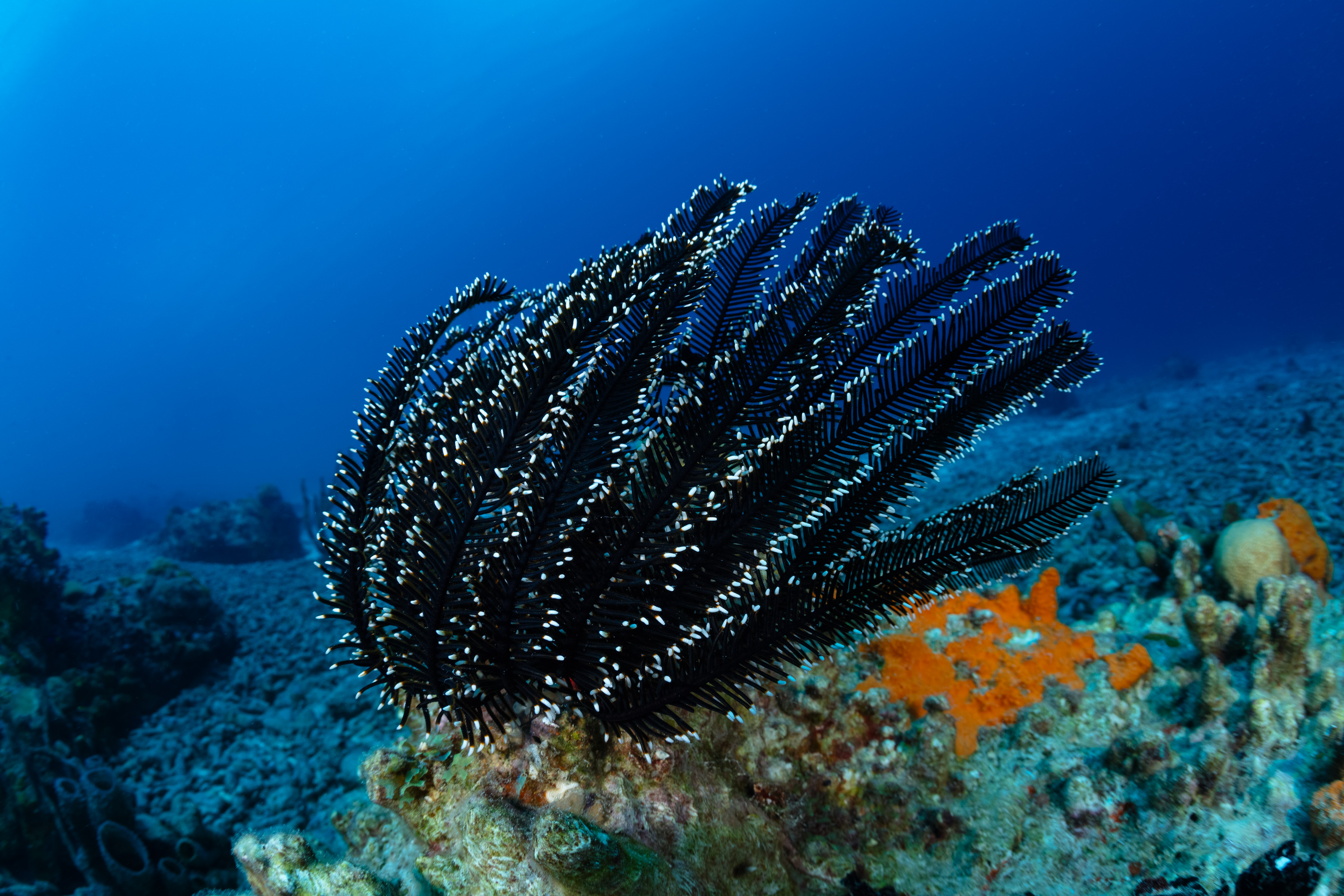 This Crinoid has long, black arms with short branches tipped in white. Small legs help it attach to sponges or other surfaces.