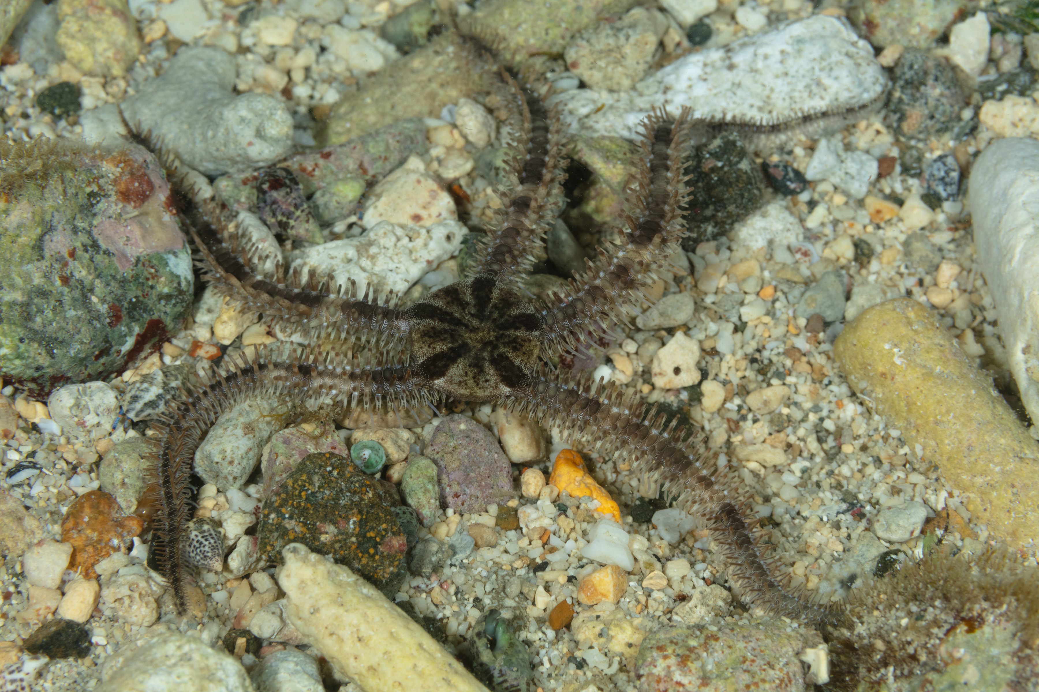 The Blunt-Spined Brittle Star is often hidden in rubble among rocks and is well camouflaged. It comes out at night to feed, using its long arms to trap drifting food particles or small animals from the water.