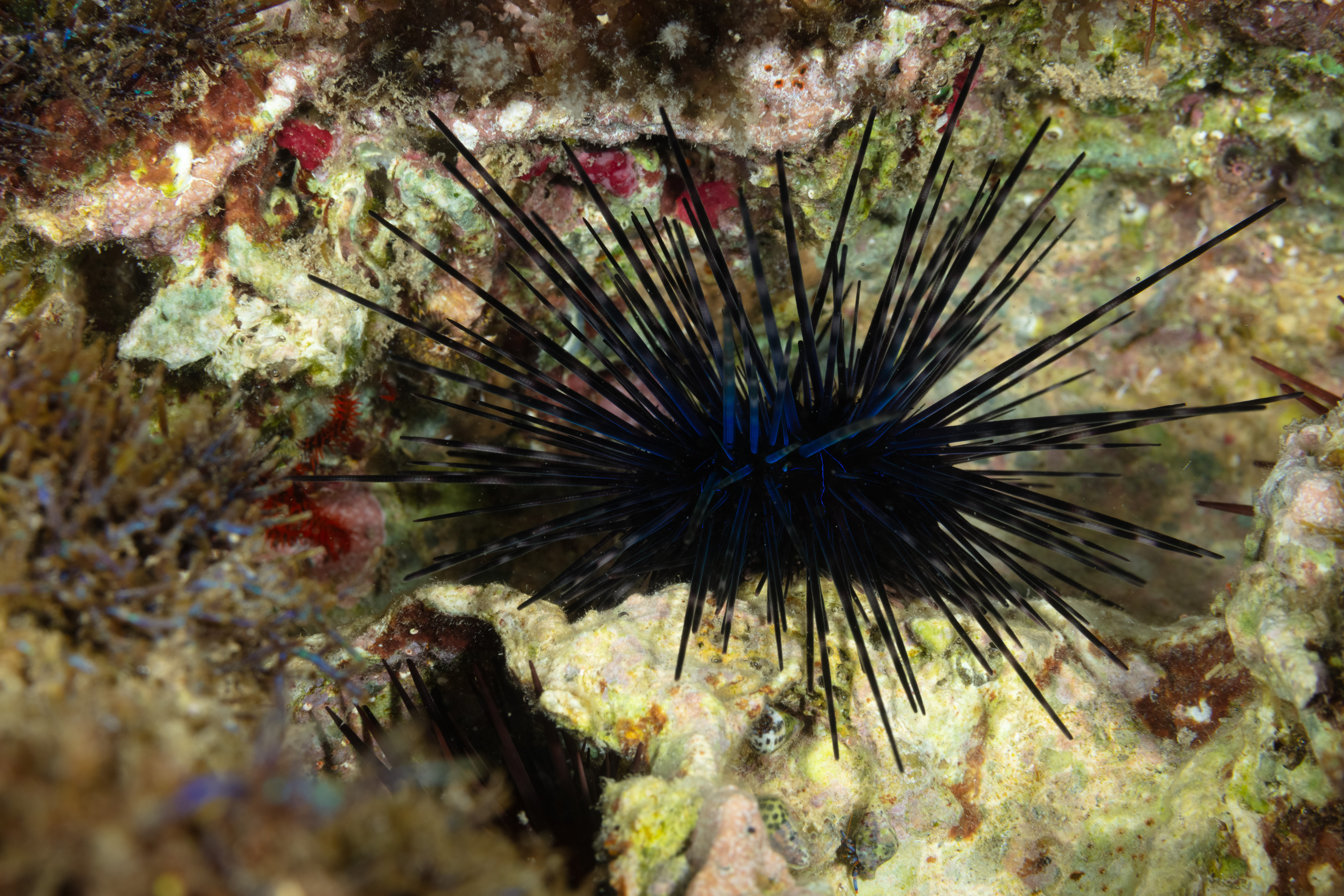 The Long-Spined Urchin hides during the day and comes out at night to forage. It is often seen in groups on or beneath rocky surfaces.
