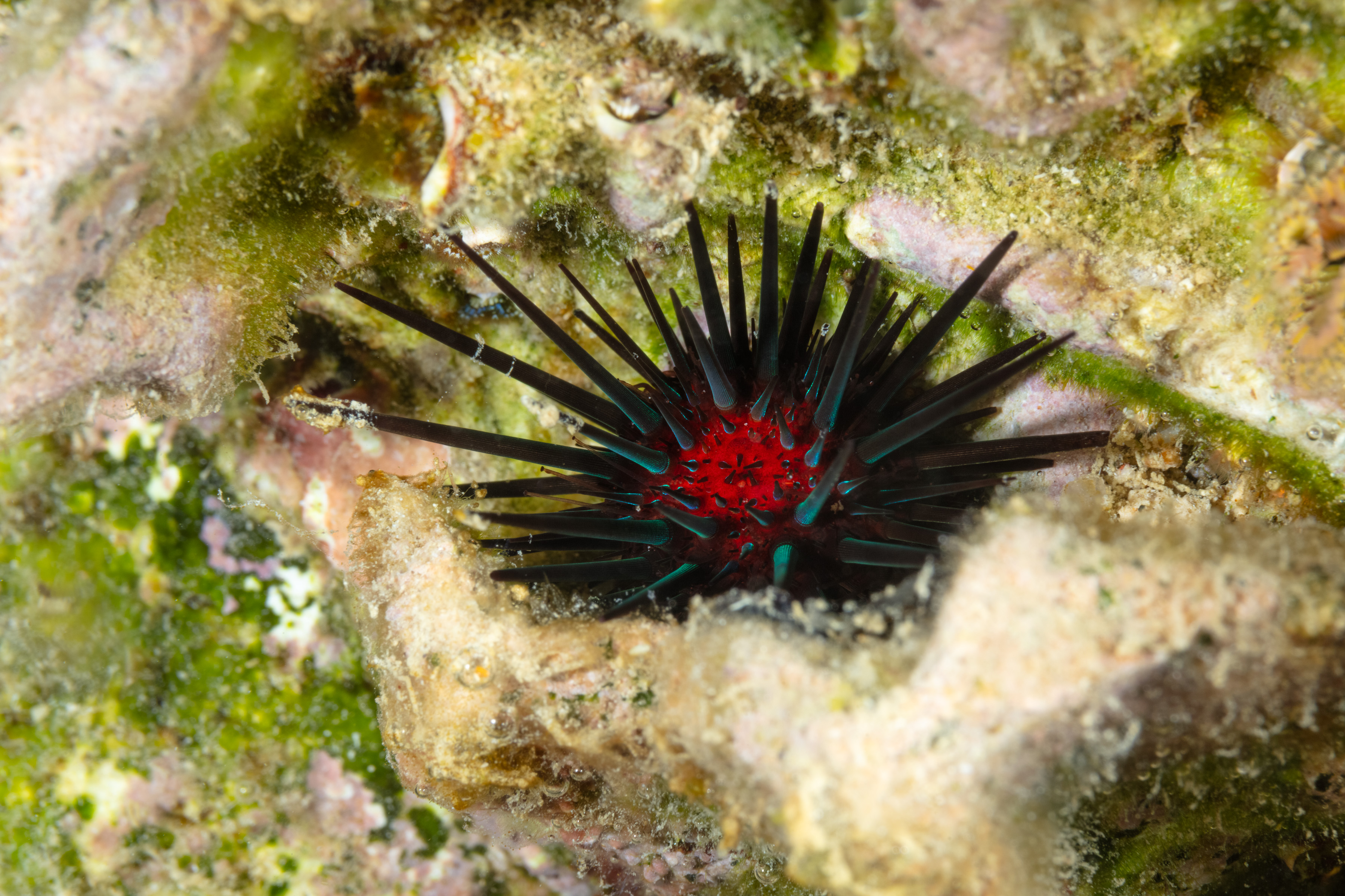 This Urchin has short, thick, sharply pointed spines that are usually black or red. The underlying body, or shell, is typically solid black, red, brown, or bluish.