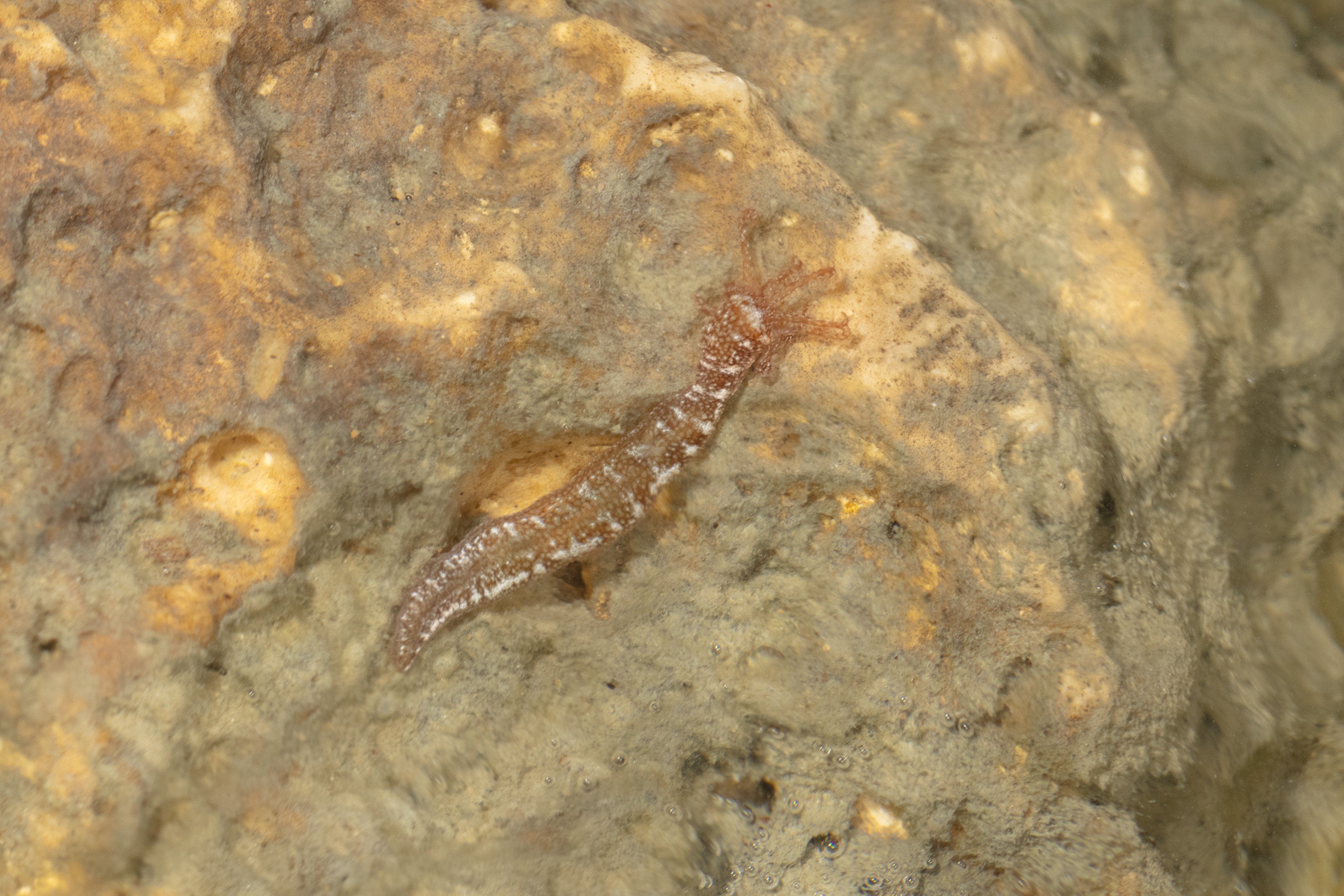 The Seaweed Sea Cucumber has a small, stretchy body that has twelve feather-like feeding arms. Adults are dull green to reddish brown with white patches, while juveniles are almost see-through.