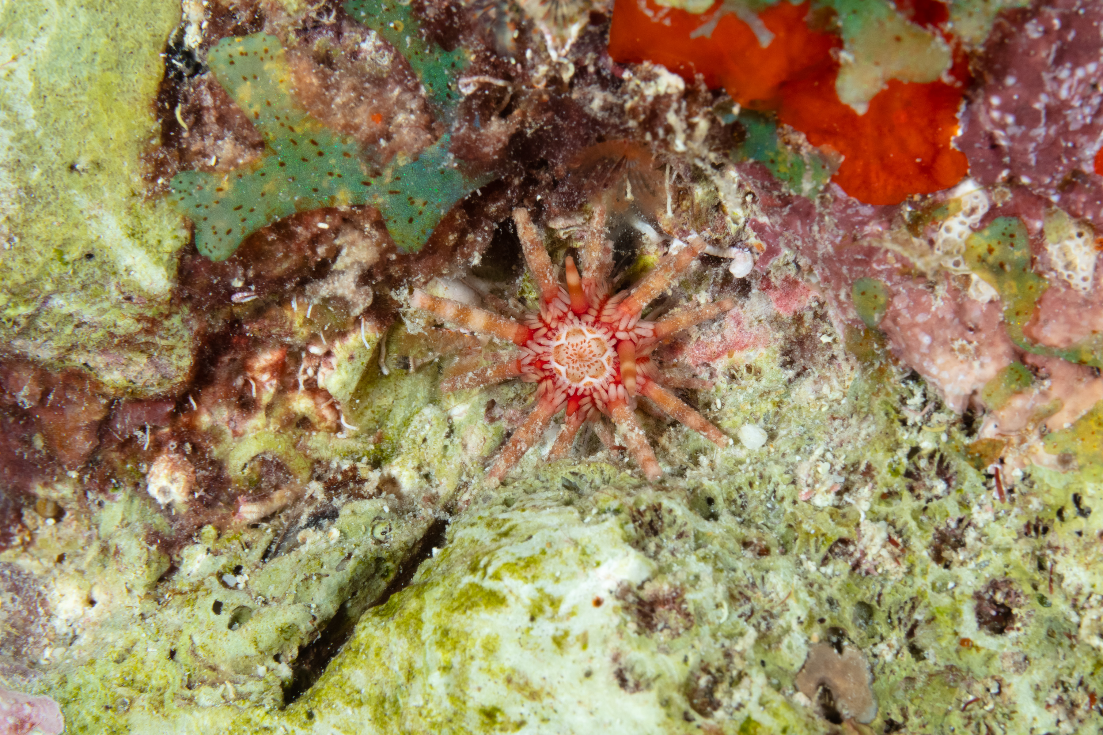 The Slate Pencil Urchin anchors itself into crevices during the day.