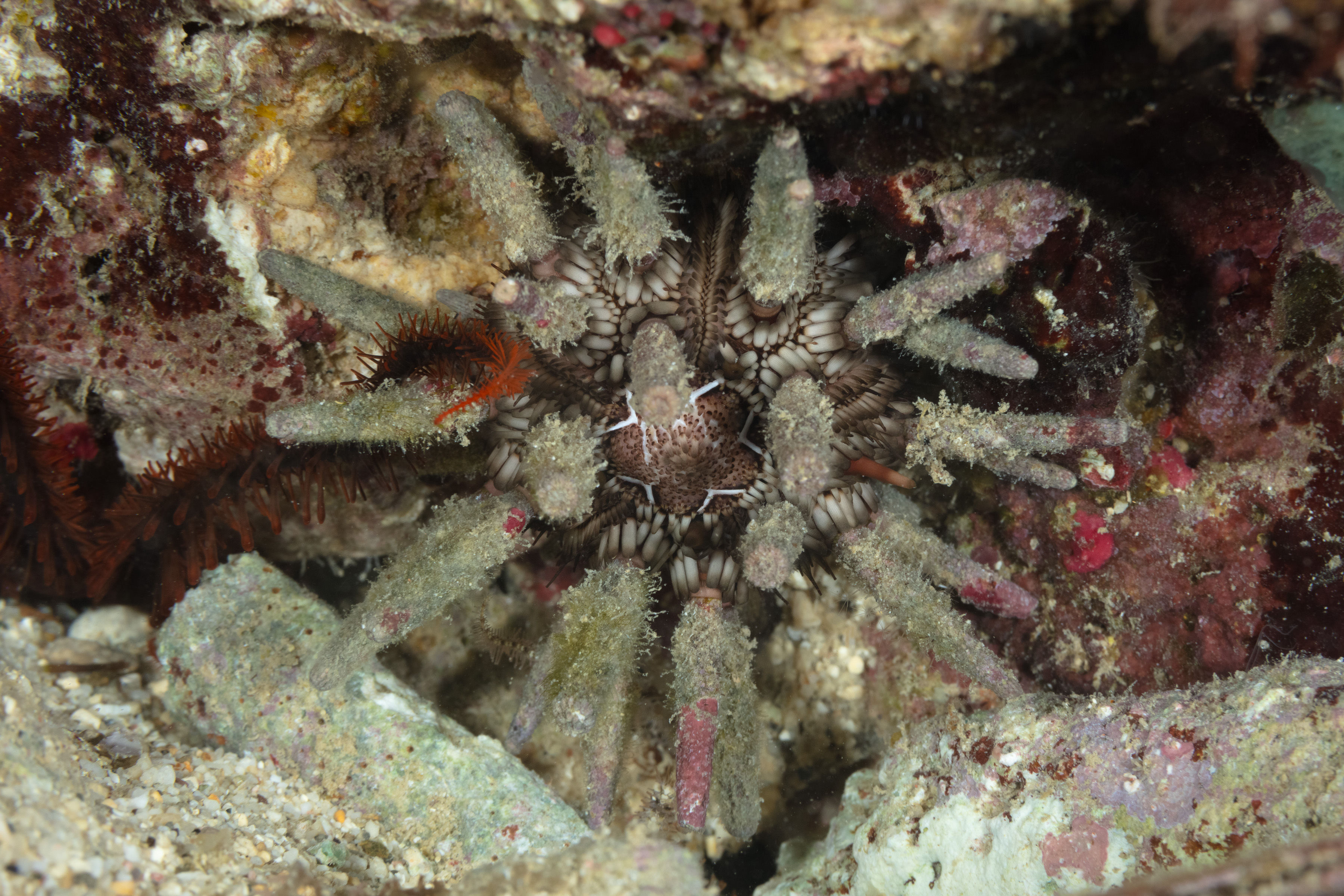 The Slate Pencil Urchin anchors itself into crevices during the day.
