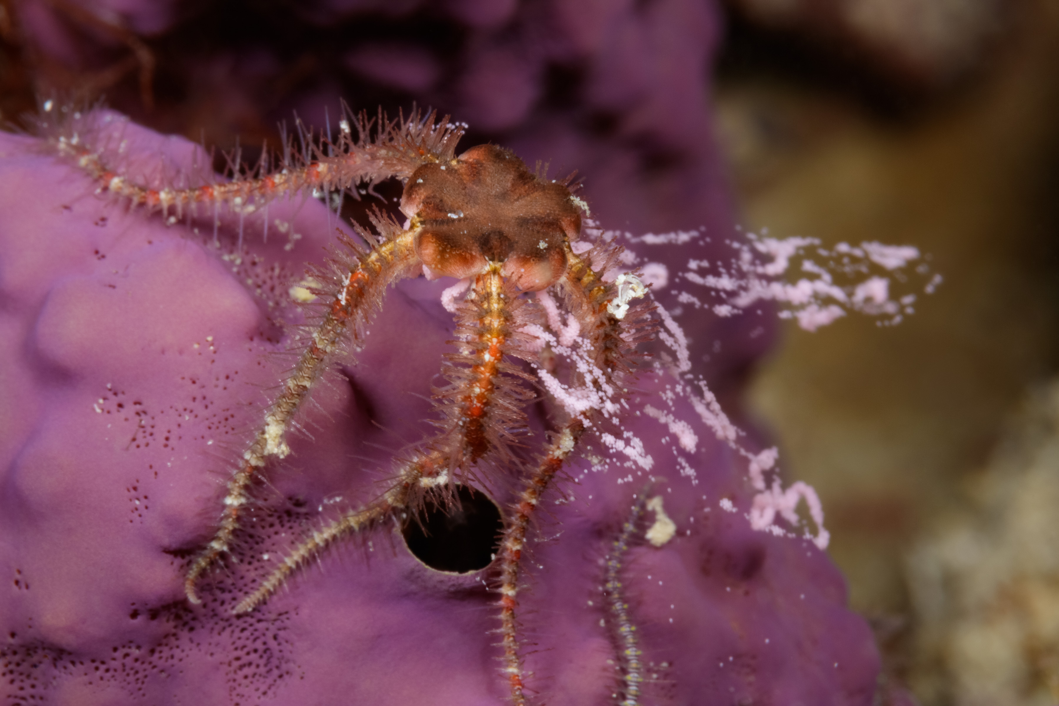 This Brittle Star is shy and found hiding under rocks and in crevices, and is active mostly at night. It is a filter feeder, eating small particles from the water and debris from the seafloor. It has also been known to eat fleshy algae and eggs. A notable fact is that it can shed its arms when threatened and fully regenerate a lost arm over time.