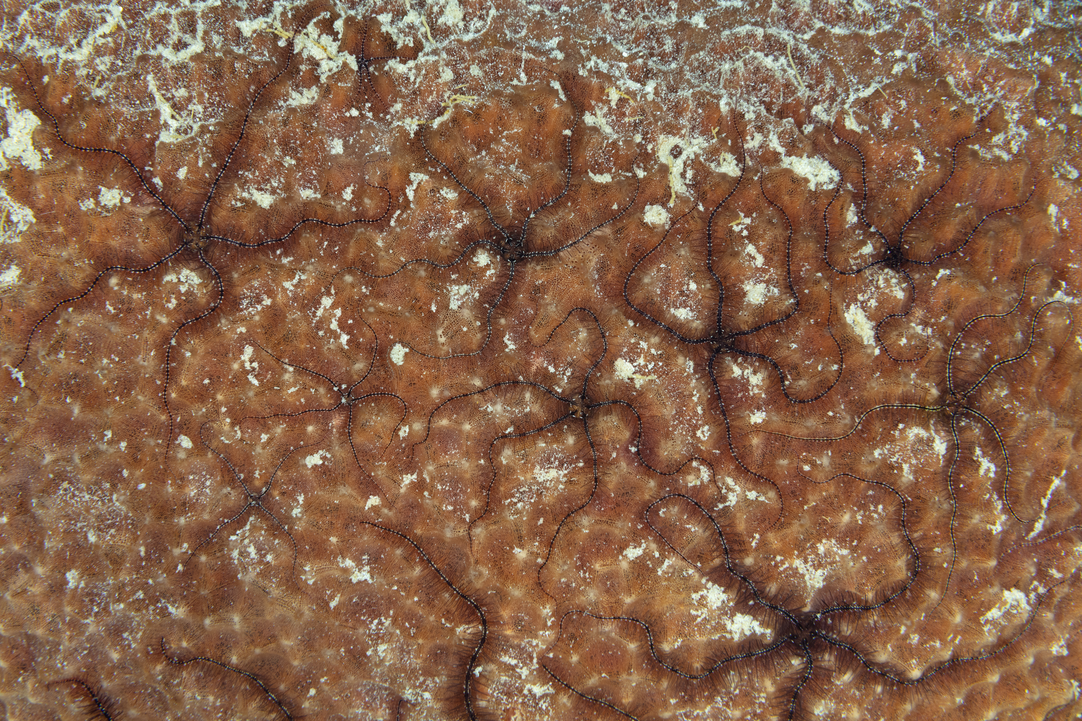 This Brittle Star can be found on sponges and corals. It also lives in other habitats like mangroves and seagrass. During the day, it is often exposed and remains still, blending in with its host, while juveniles are also seen out in the open. To feed, it climbs to a high point on its host and extends its arms to catch tiny particles and plankton floating in the water.