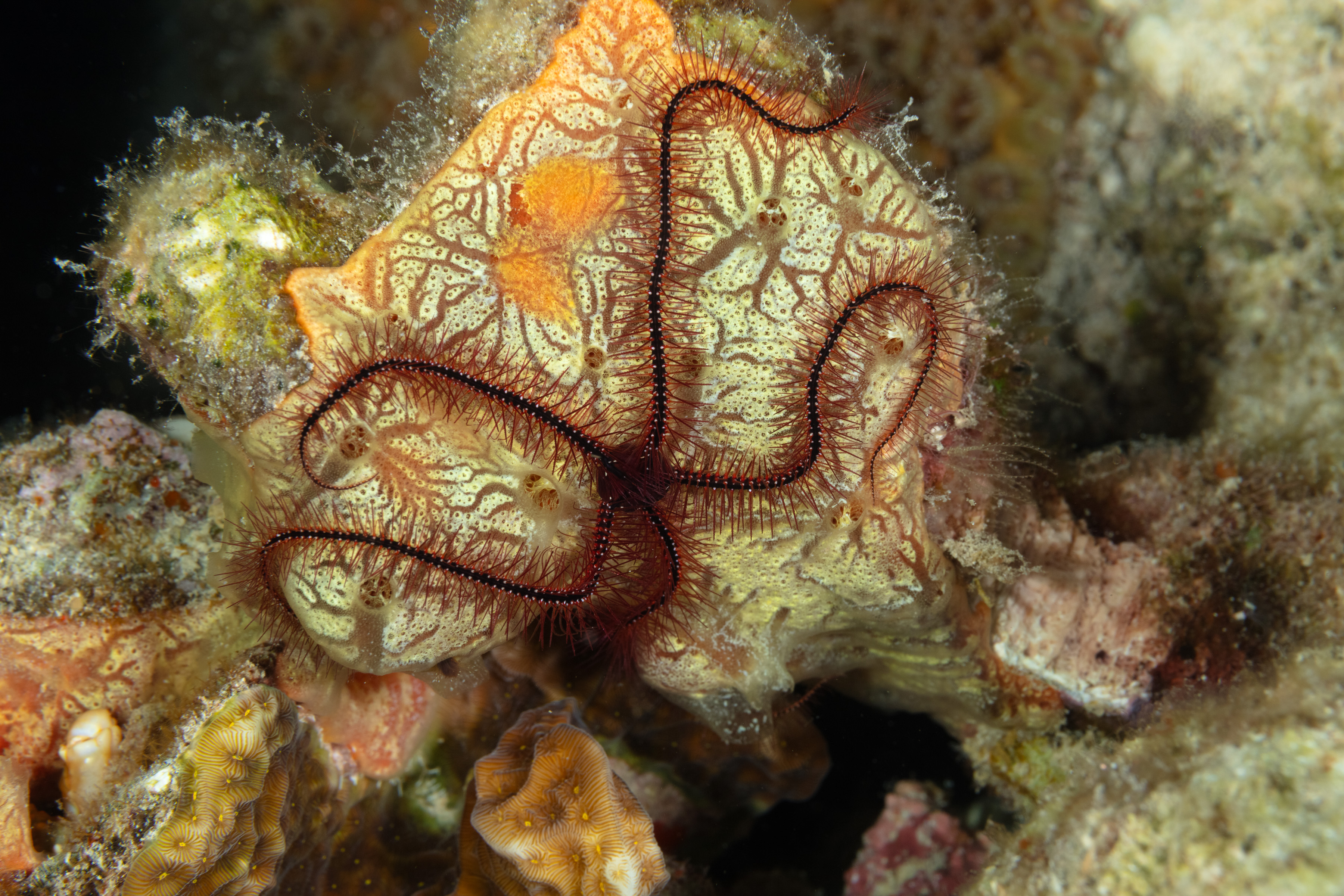 This Brittle Star can be found on sponges and corals. It also lives in other habitats like mangroves and seagrass. During the day, it is often exposed and remains still, blending in with its host, while juveniles are also seen out in the open. To feed, it climbs to a high point on its host and extends its arms to catch tiny particles and plankton floating in the water.